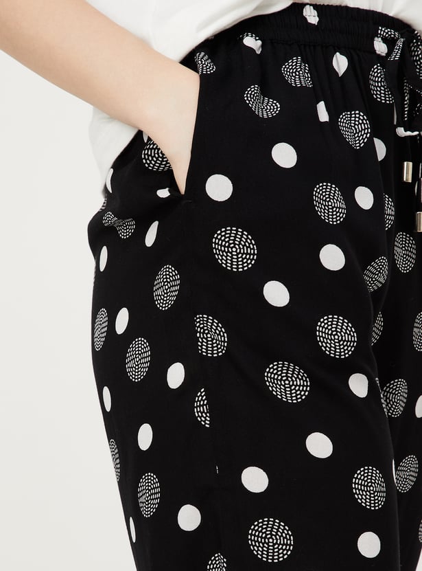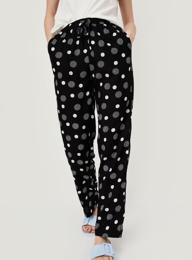 Day or night, stay comfy and stylish in these pyjamas. Featuring polka dot prints and an elasticated waist with a drawstring, they offer the perfect mix of comfort and charm for a relaxed vibe anytime. The side pockets ensure functionality. Model Size :