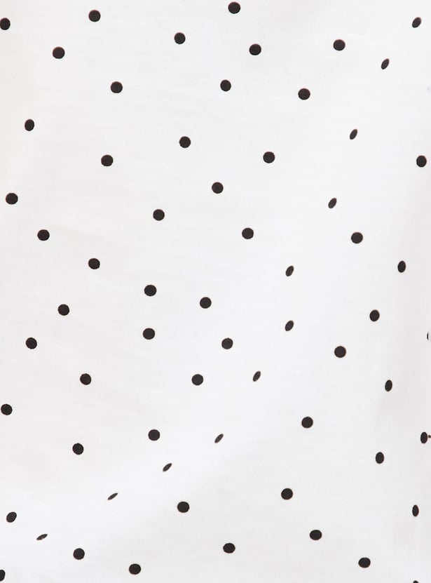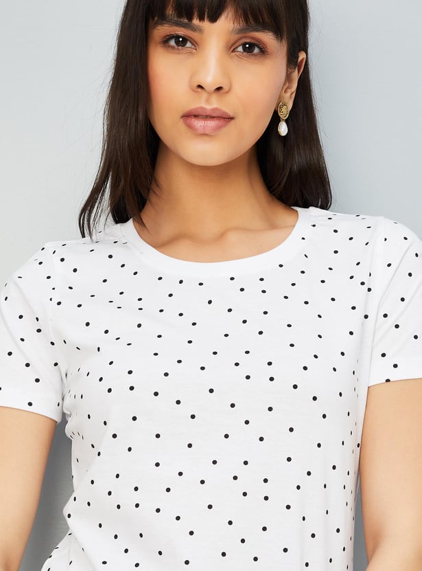 Look cool and casual in this T-shirt. It is styled with a round neck, half sleeves, and a straight hem. All-over polka dot prints lend a playful flair.