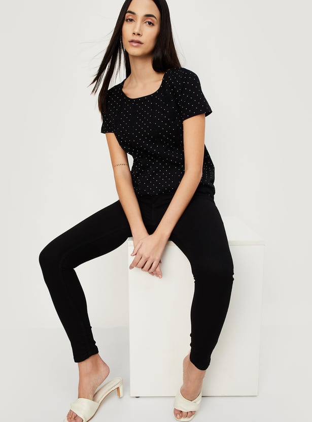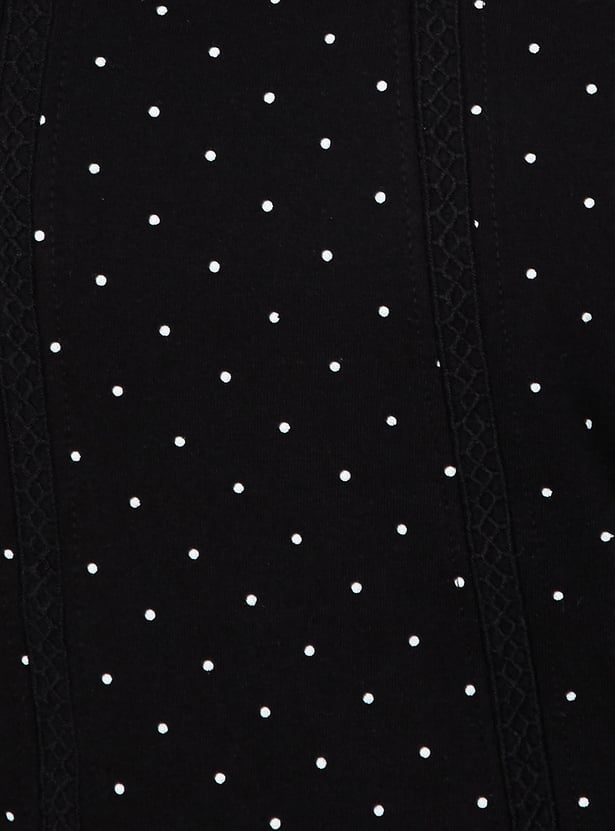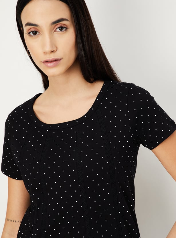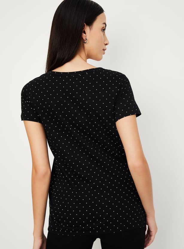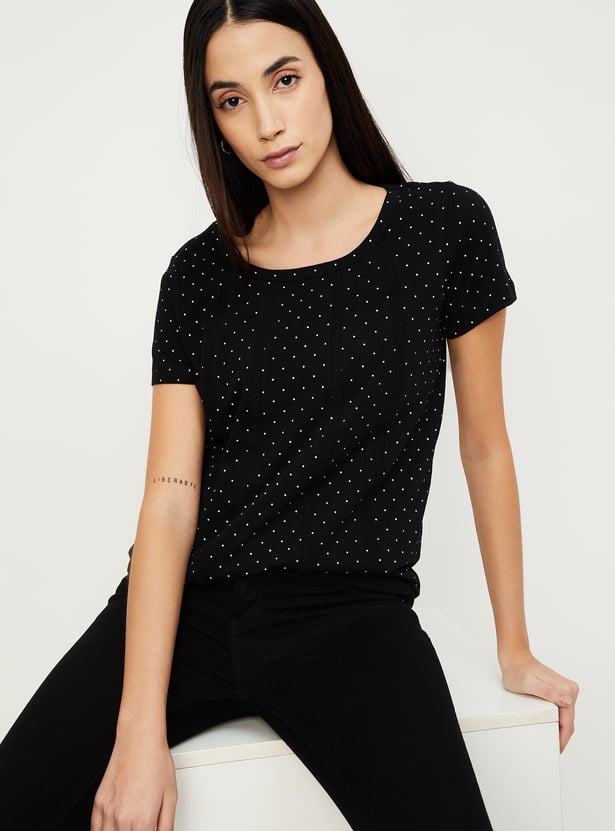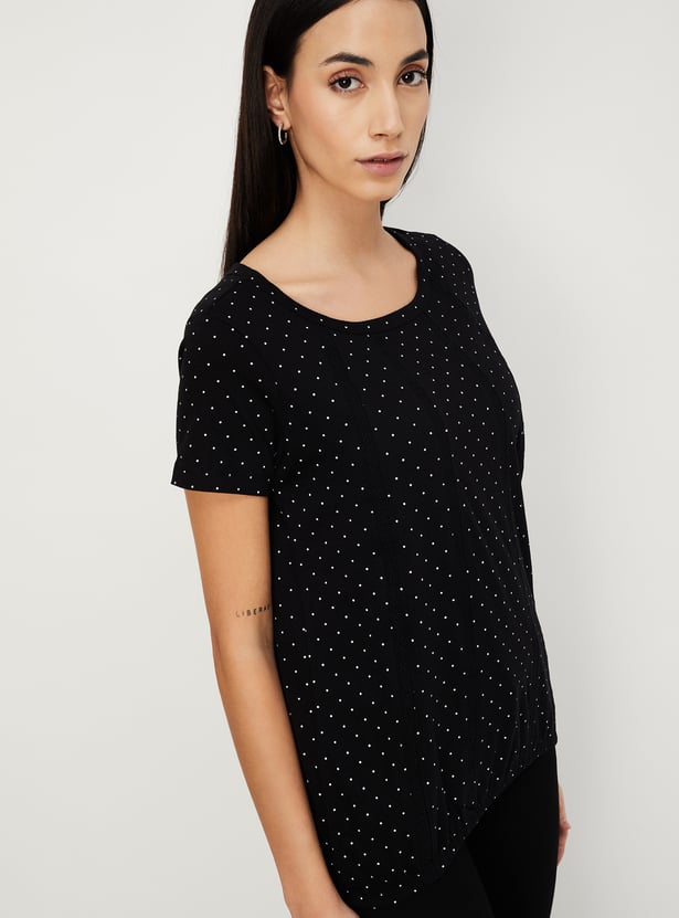 Elevate your casual look with this trendy polka dot t-shirt featuring half sleeves, a round neck, and an elasticated hem. Perfect for adding a touch of style to your everyday wardrobe.