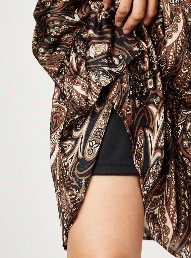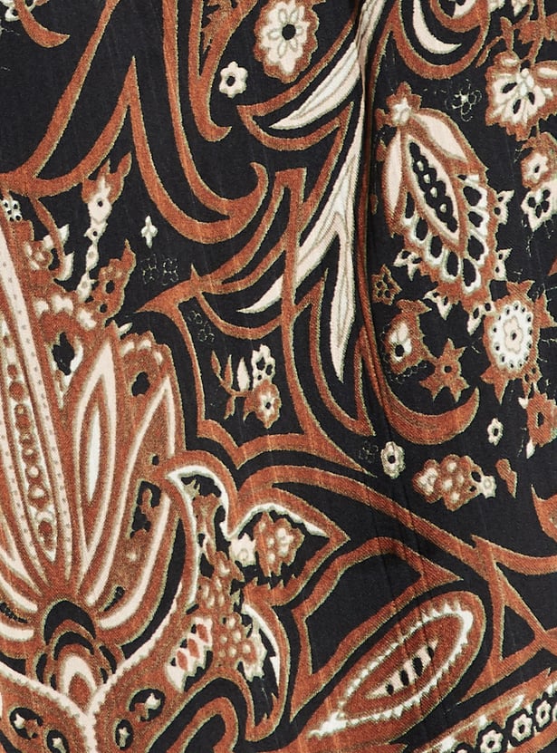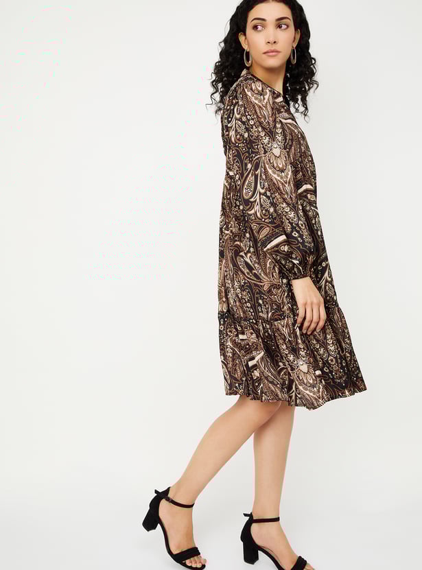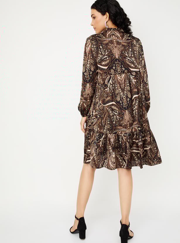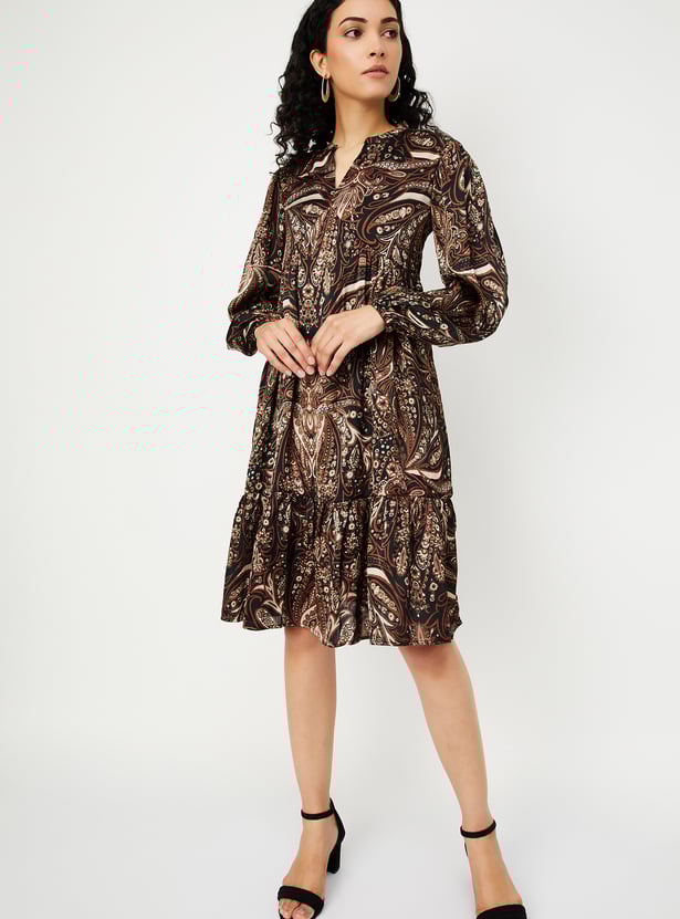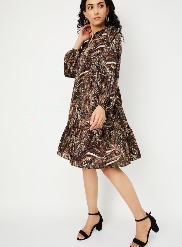 Own your style revolution with this foil-printed casual dress. Its band collar, full sleeves, and knee-length design combine to create an effortlessly beautiful and dreamy outfit.