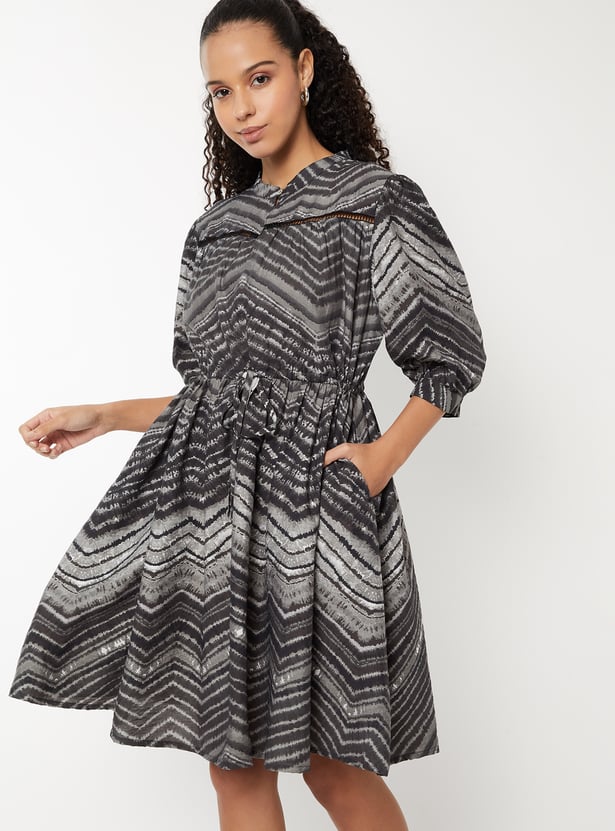 Turn heads in this printed A-line dress, featuring a band collar, puff sleeves, and a flattering knee-length silhouette. Designed with a side pocket for added ease, it blends style with everyday comfort.