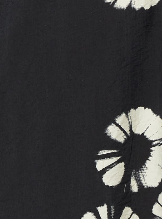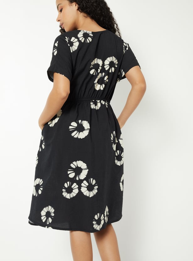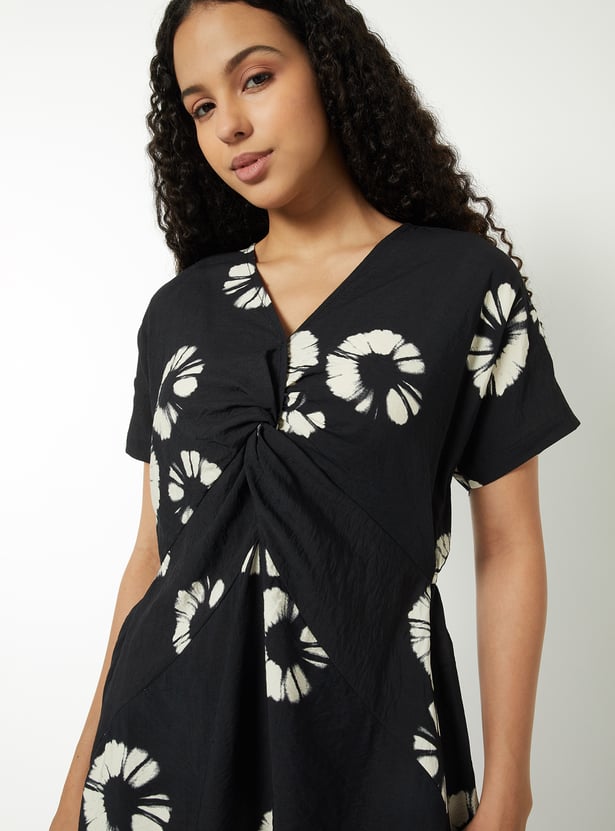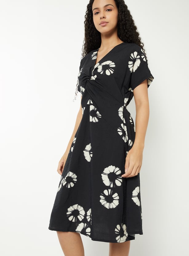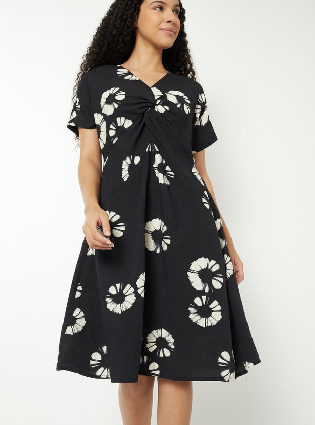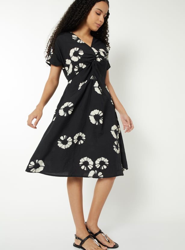 This printed A-line dress features a flattering V-neckline, half sleeves, and a twisted detail on the bodice for added shape. Designed with a back elasticated waist and knee-length hem, it offers both comfort and elegance.