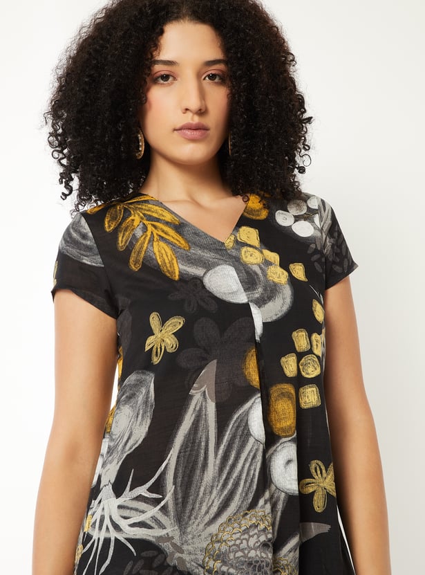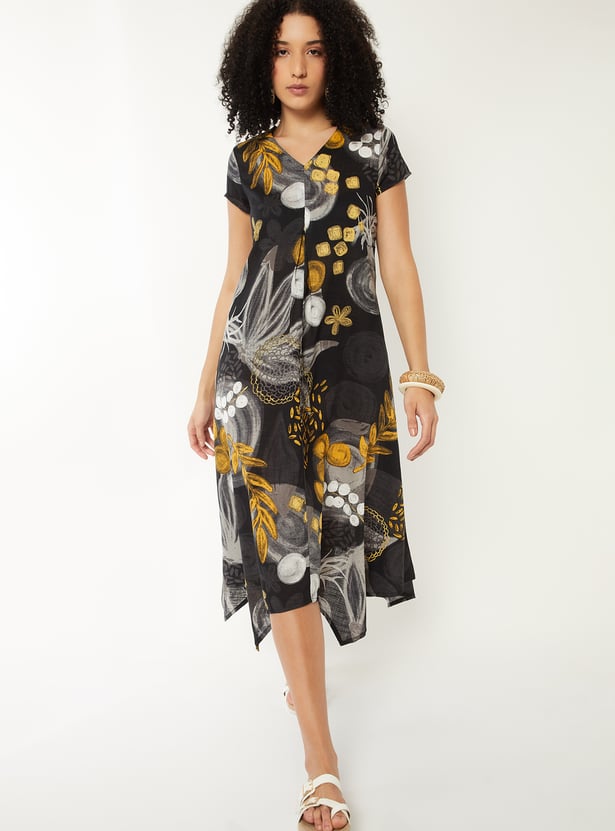 Chic and contemporary, this printed A-line midi dress features a flattering V-neckline and comfortable half sleeves. The standout asymmetric hem adds movement and a modern twist to the classic silhouette, making it perfect for both casual outings.