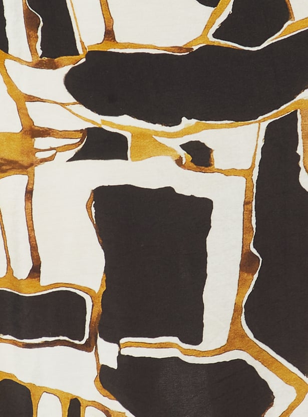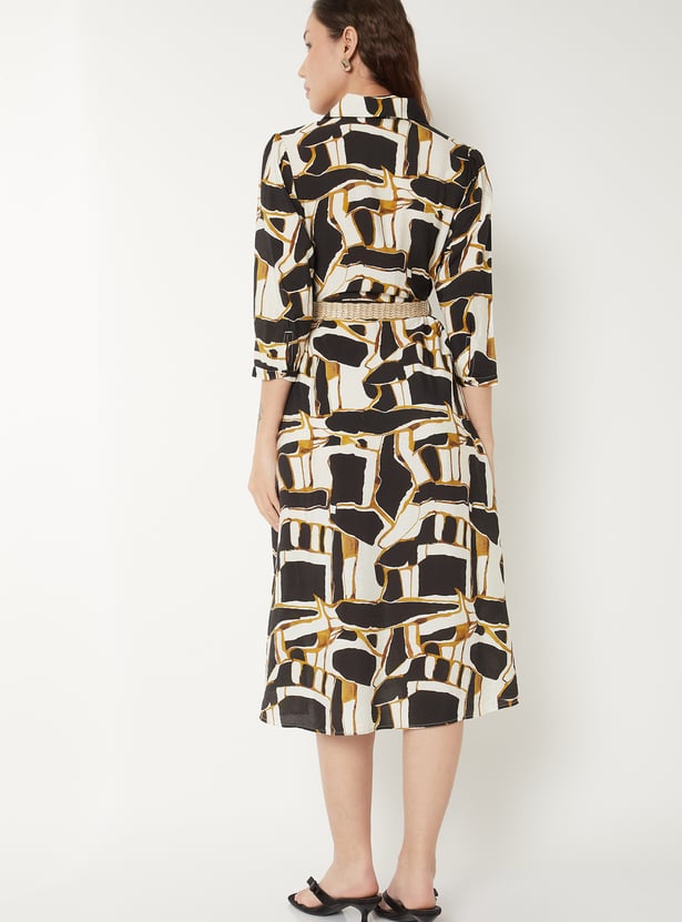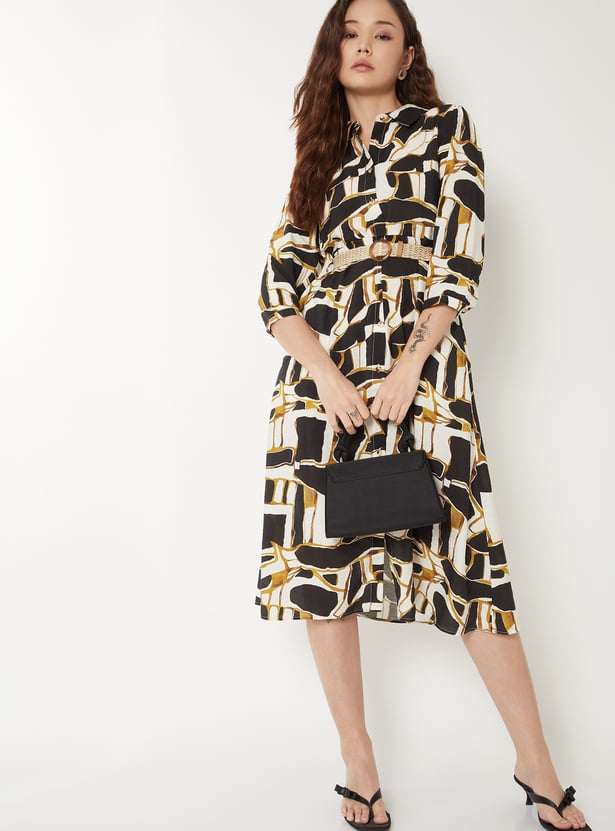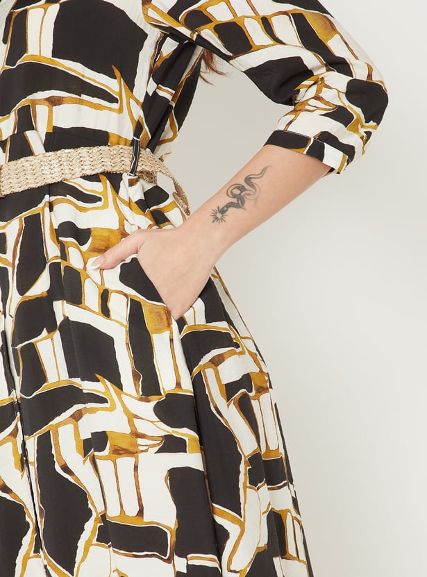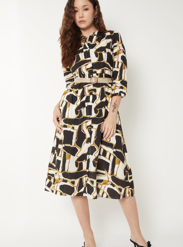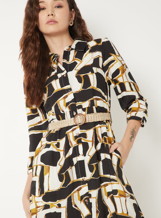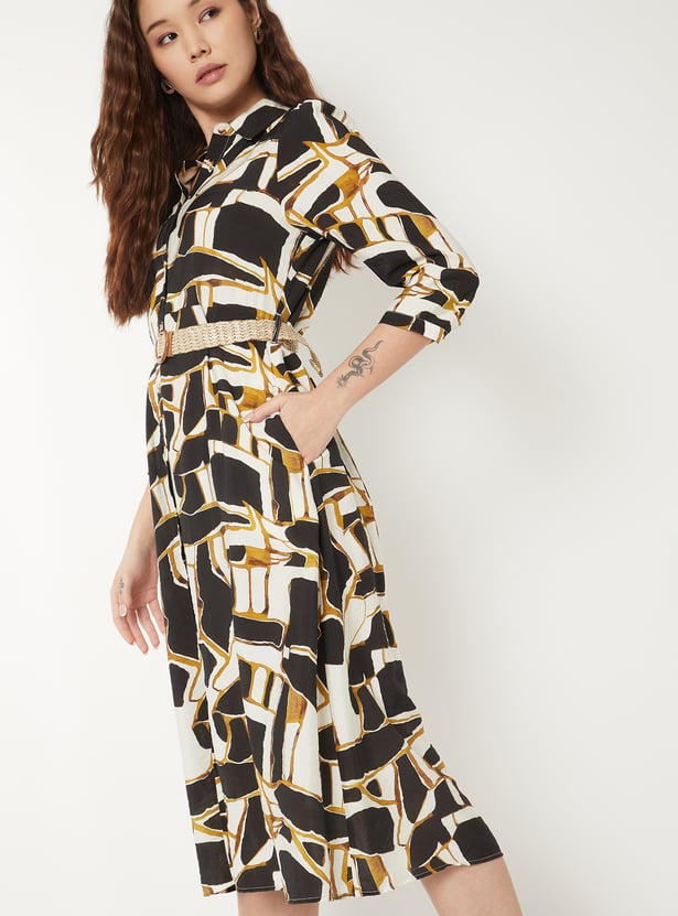 This printed A-line shirt dress features a sharp spread collar, 3/4th sleeves, and a full button-down front, effortlessly blending structure with ease. The matching belt cinches the waist, giving the silhouette a flattering, polished finish.