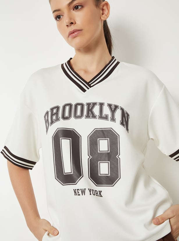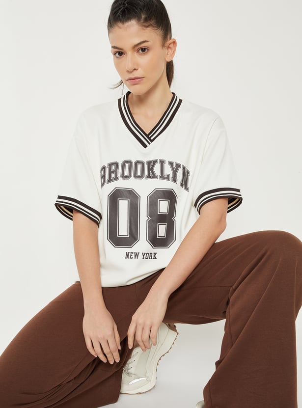 Elevate your activewear essentials with this printed boxy-fit sports T-shirt, designed with a flattering V-neck and comfortable half sleeves. The relaxed, boxy silhouette allows easy movement, making it ideal for workouts or casual wear.