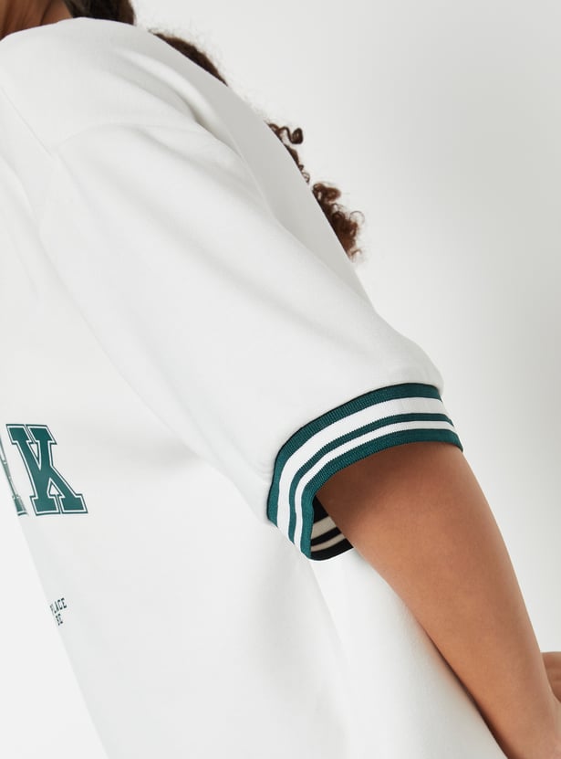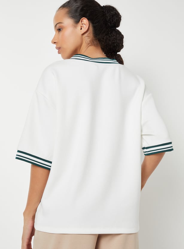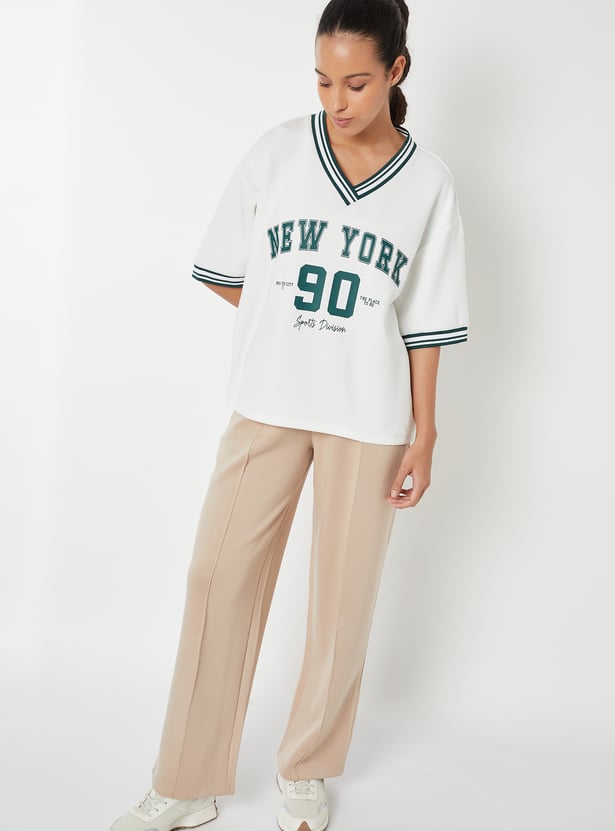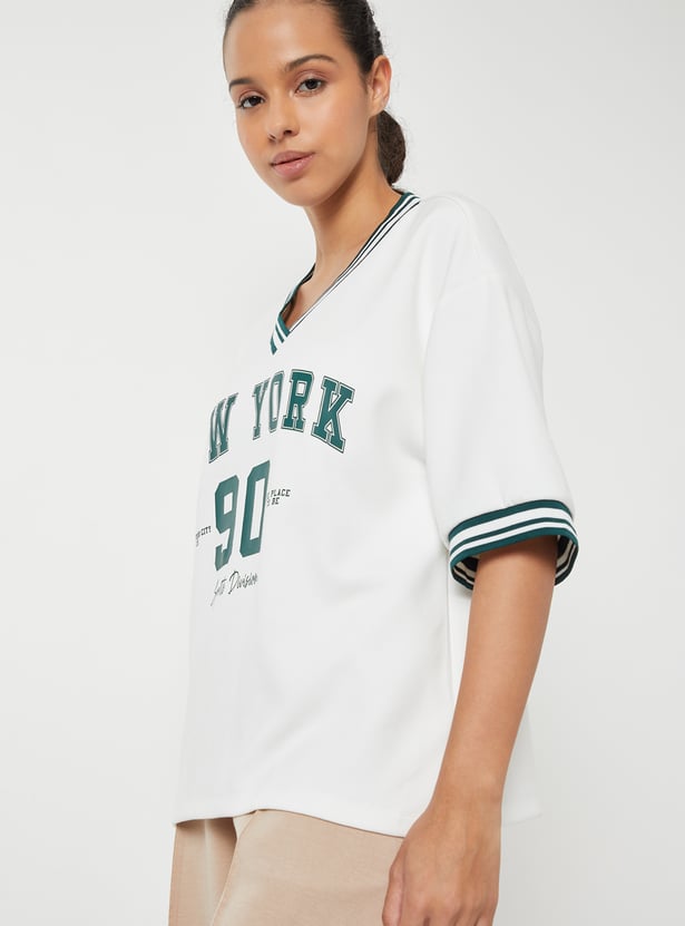 Stay on-trend with this printed boxy fit sports T-shirt, featuring a flattering V-neck and half sleeves. The relaxed silhouette offers comfort without compromising style.