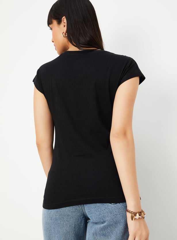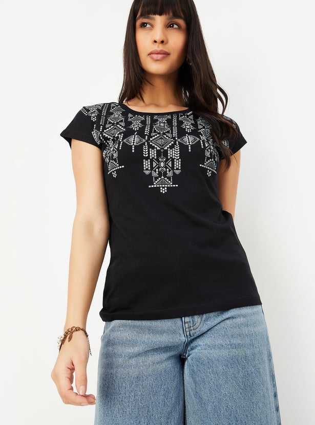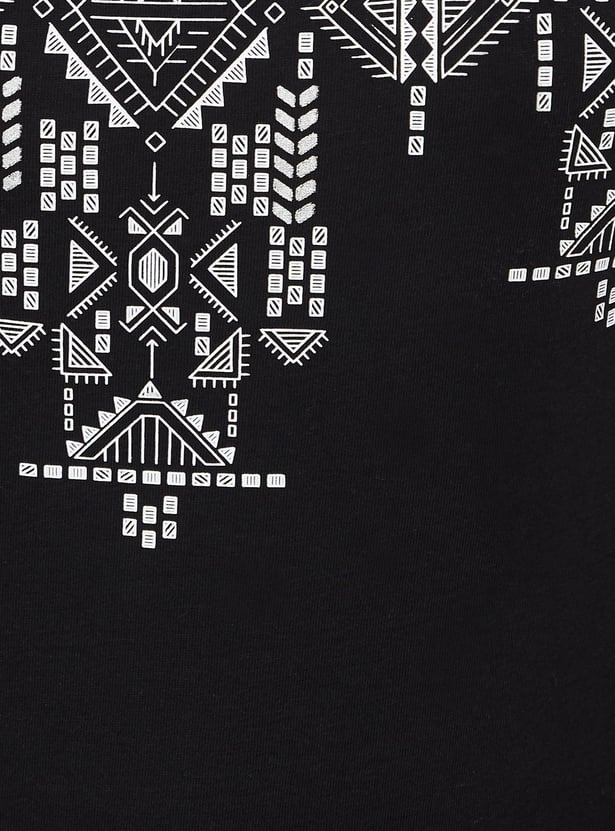 Give a boho-chic vibe to your look with this T-shirt. It is styled with a round neck, extended sleeves, and a straight hem. The graphic print at the yoke elevates the overall style.