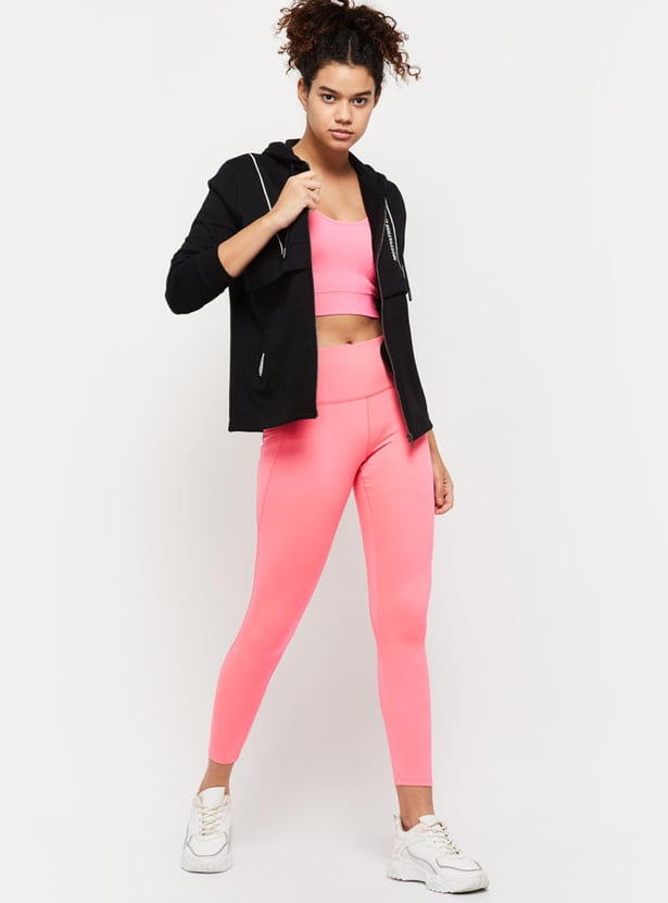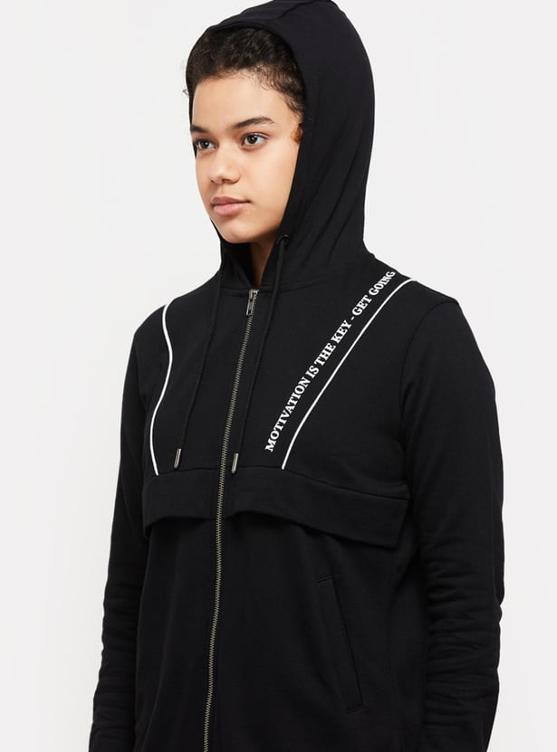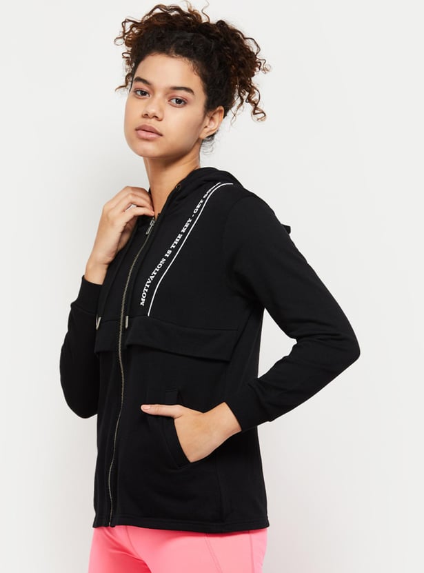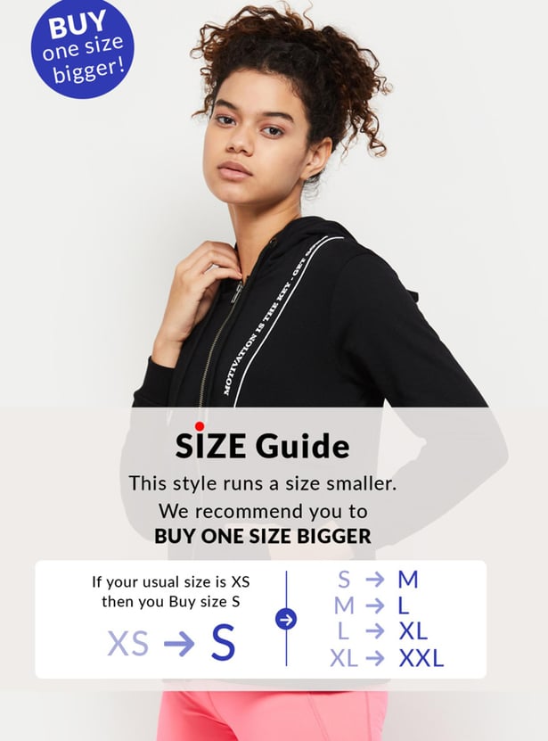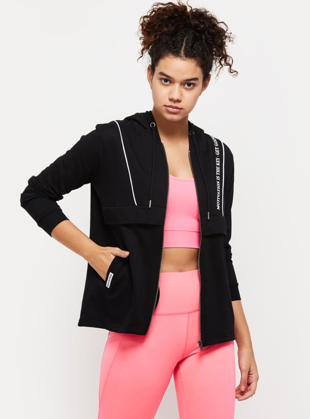 An ideal pick for your sports wardrobe, this jacket is designed with a printed surface, a hooded neckline, zip closure, side pockets, and full sleeves. Layer this jacket over your crop top and joggers for a sporty look.