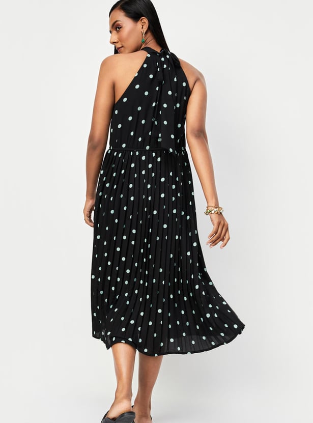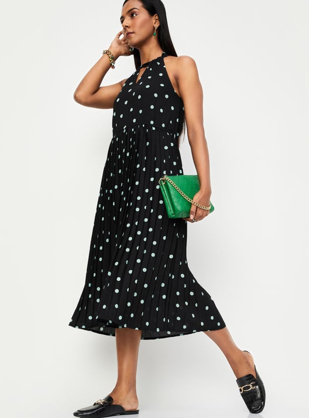 Summer evening calls for this elegant midi dress highlighted with all-over prints and a pleated skirt. It features a halter neckline with a tie-up at the back, a cut-out at the front, and a sleeveless construction. Pair this dress with flat mules to elevate the style.