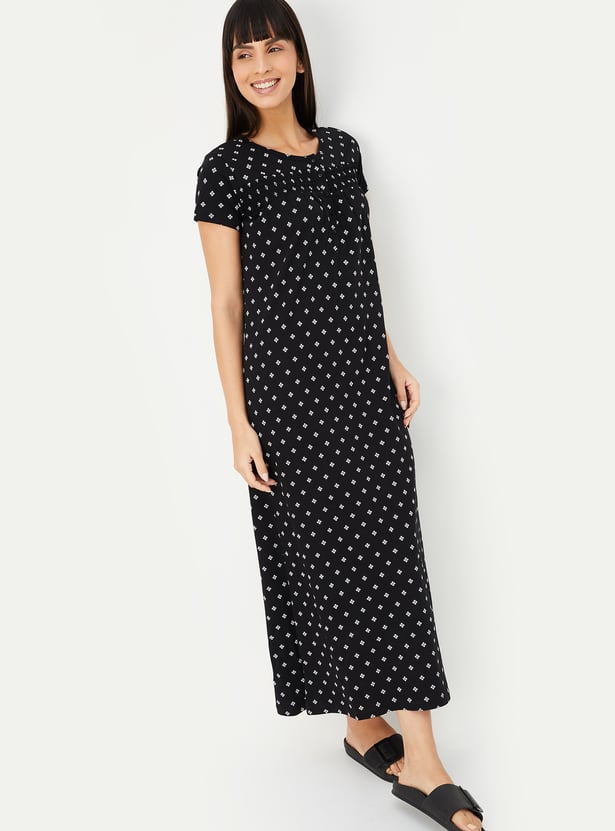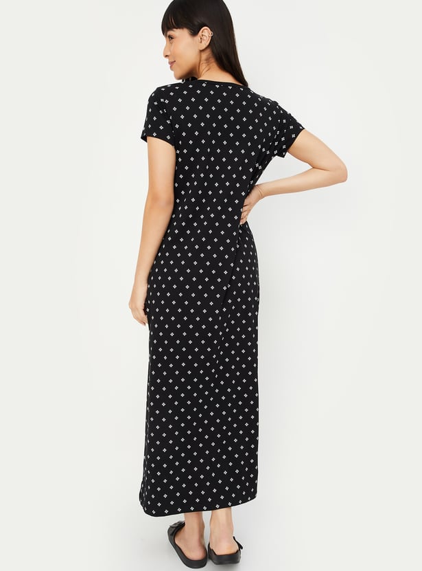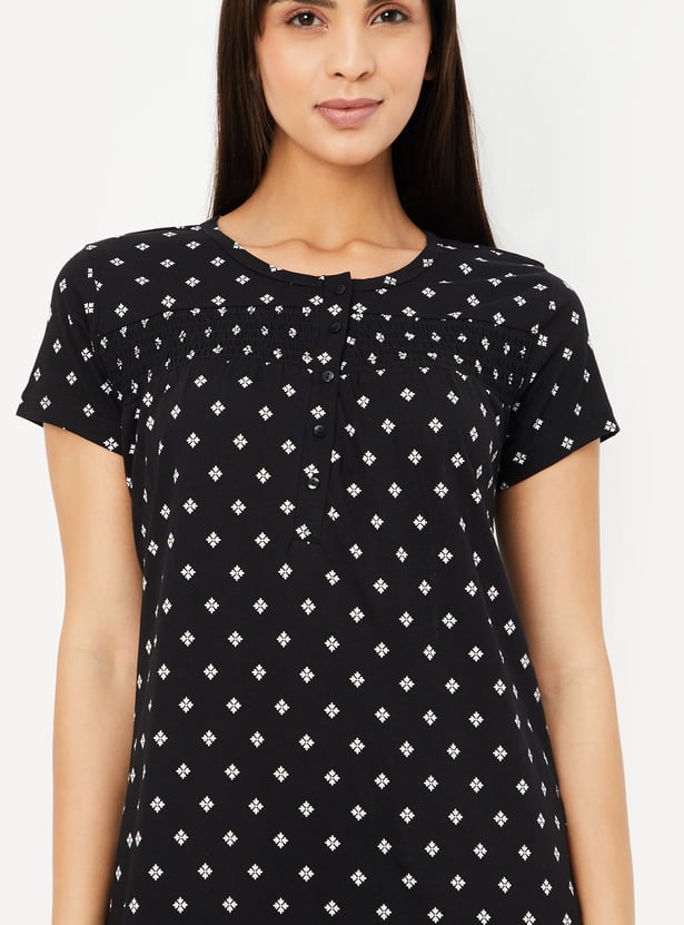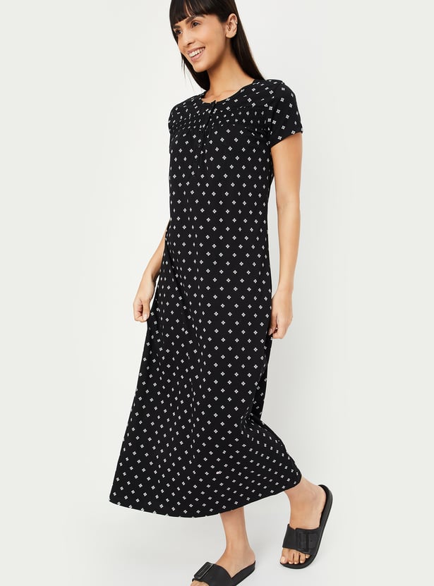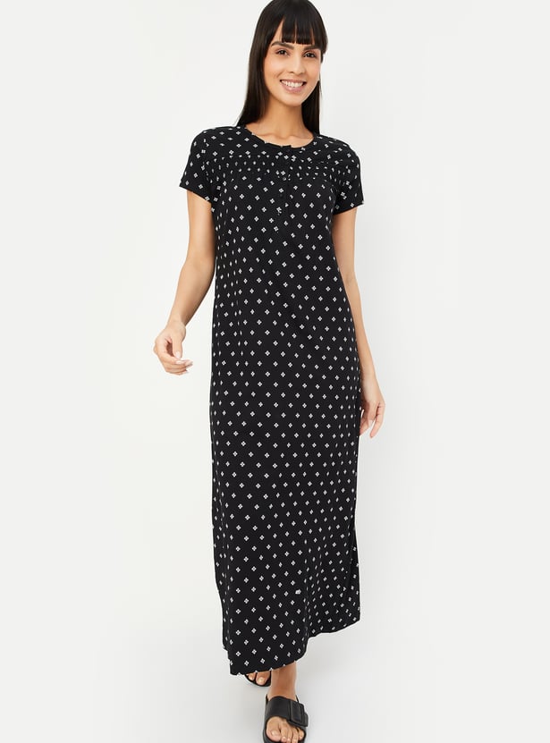 Add a touch of charm to your wardrobe with this printed gown featuring a round neck, half sleeves, and a button placket for easy wear. The relaxed fit makes it perfect for all-day comfort and effortless style