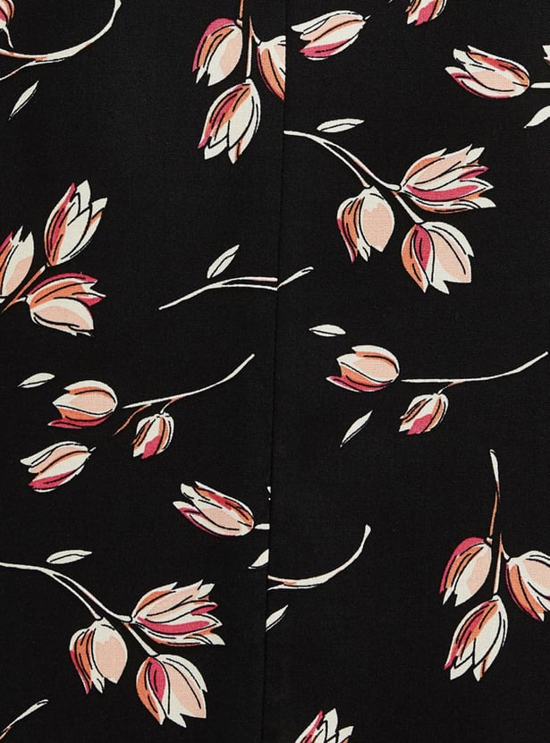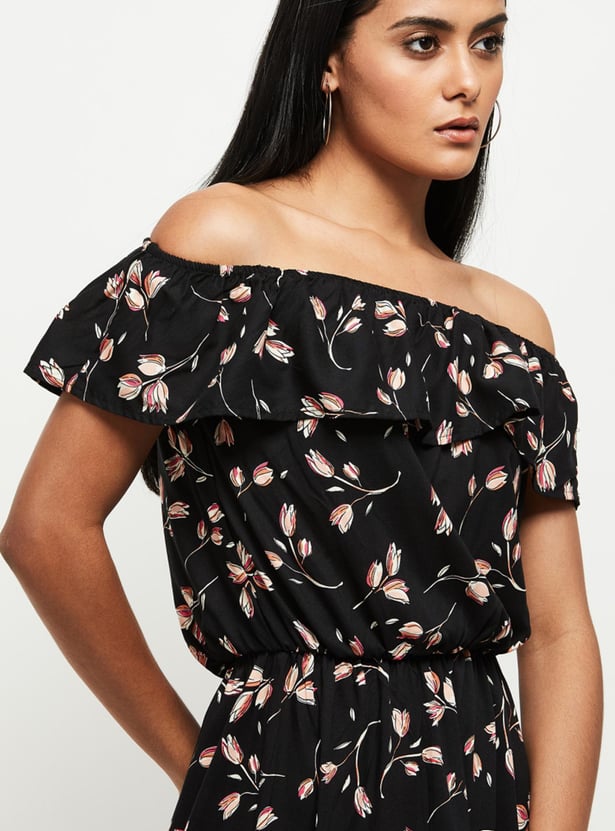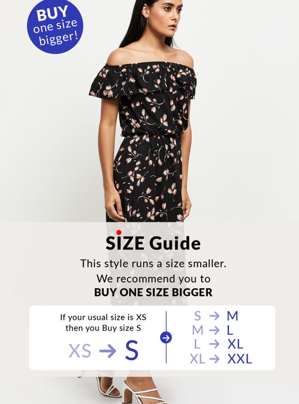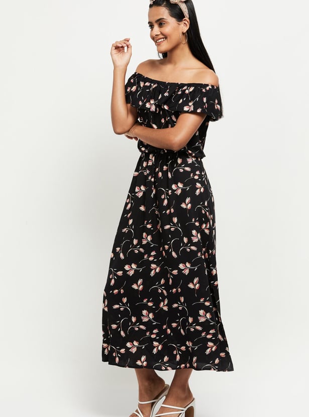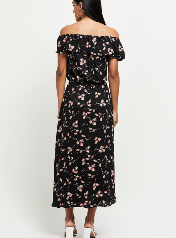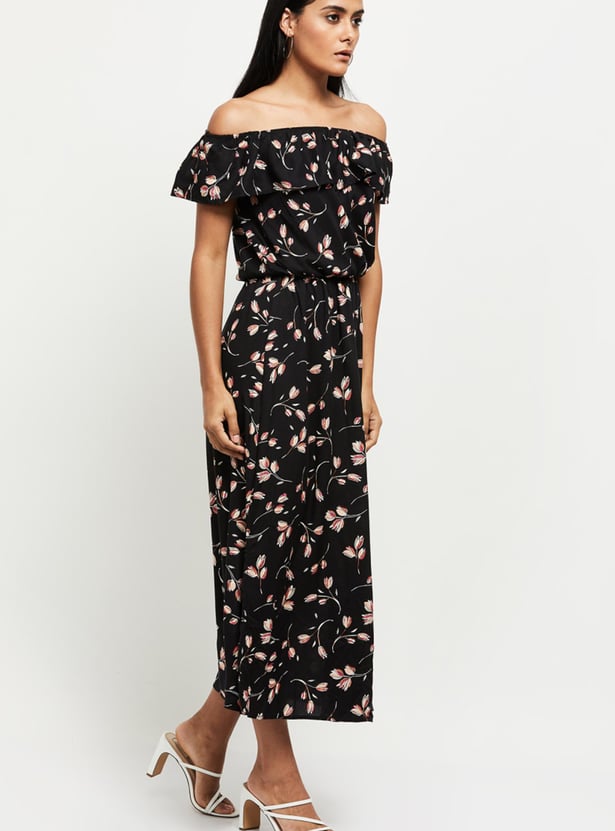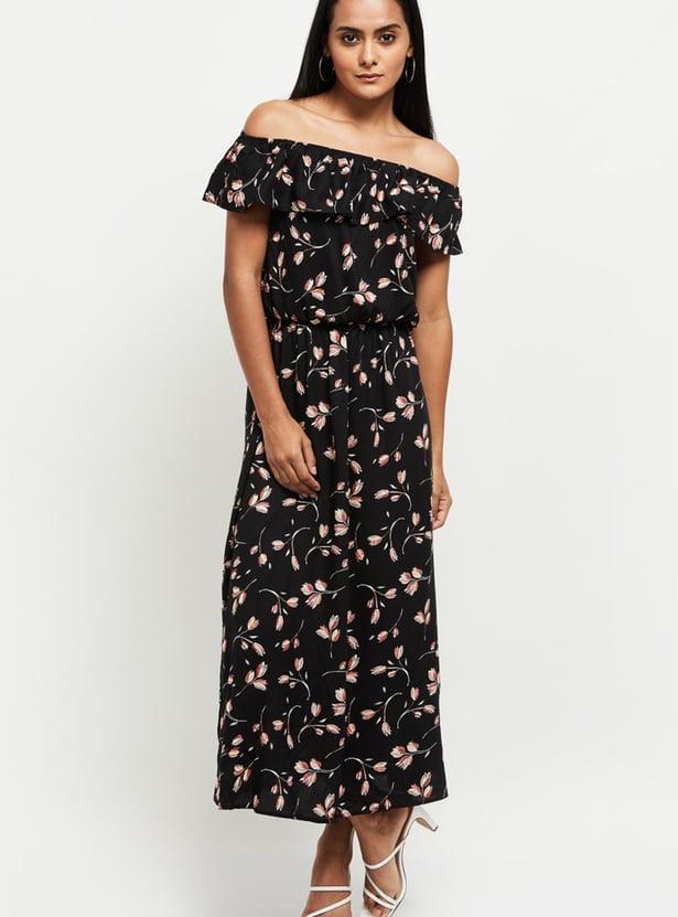 Elevate your casual look with this floral printed maxi dress designed with an off-shoulder neck, half sleeves, and front slit.