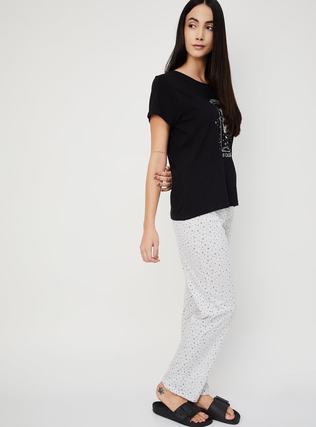 Unwind in style with this printed sleepwear set. Complete with a T-shirt featuring a round neck and half sleeves, and a pair of matching all-over printed pyjamas with an elasticated waist and drawstring, it's the perfect combination of comfort and flair for your relaxation time.
