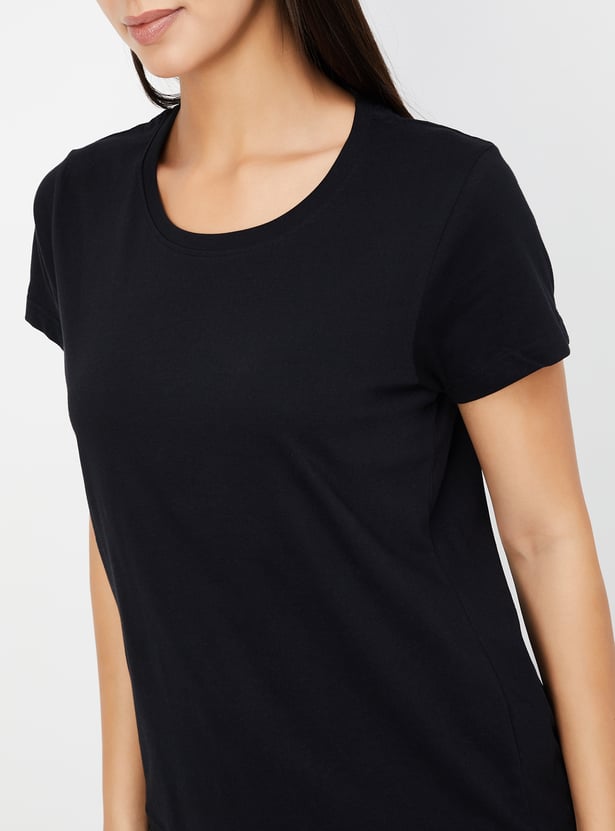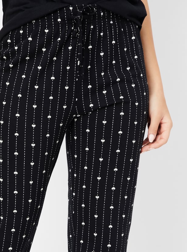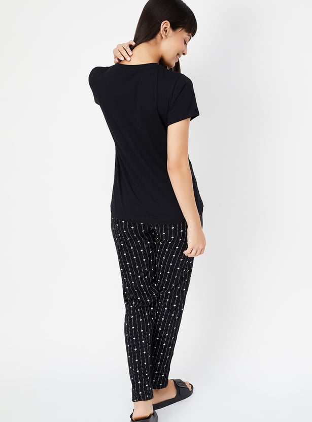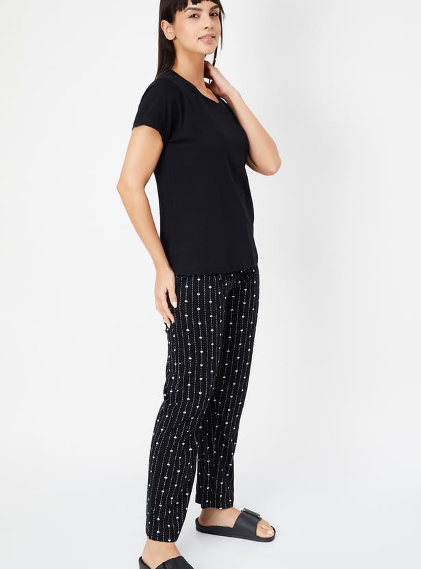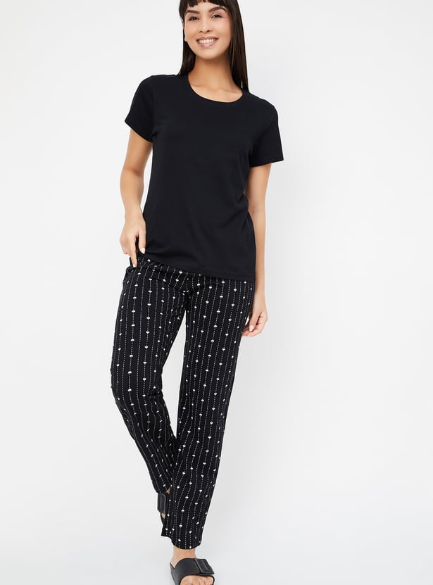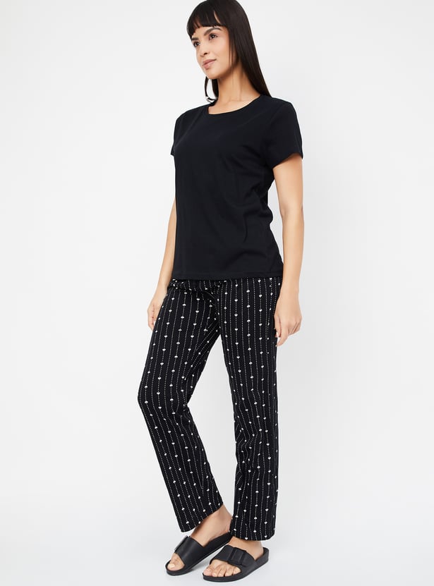 Relax in style with this comfortable and chic printed PJ set. The set includes a solid T-shirt featuring a round neck and half sleeves, perfect for a cosy night's sleep or lounging around the house. The printed pyjamas come with an elasticated waist and drawstring for a secure and adjustable fit.