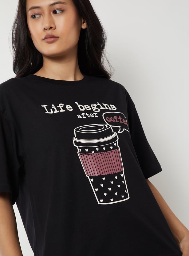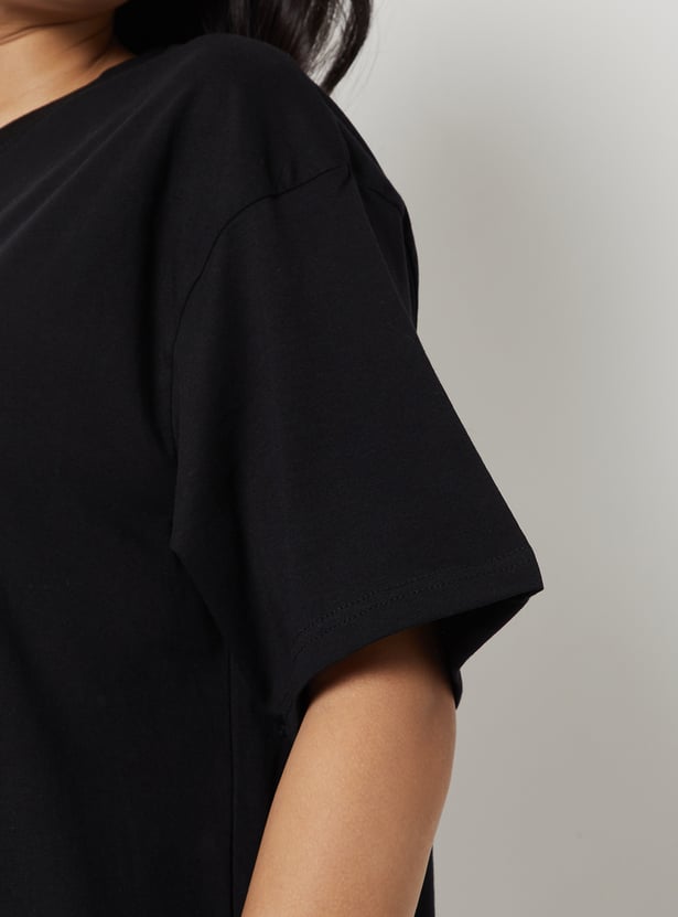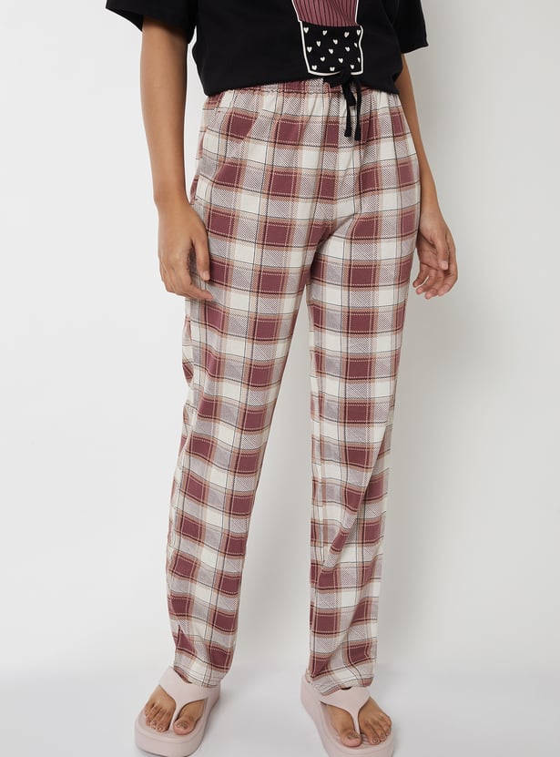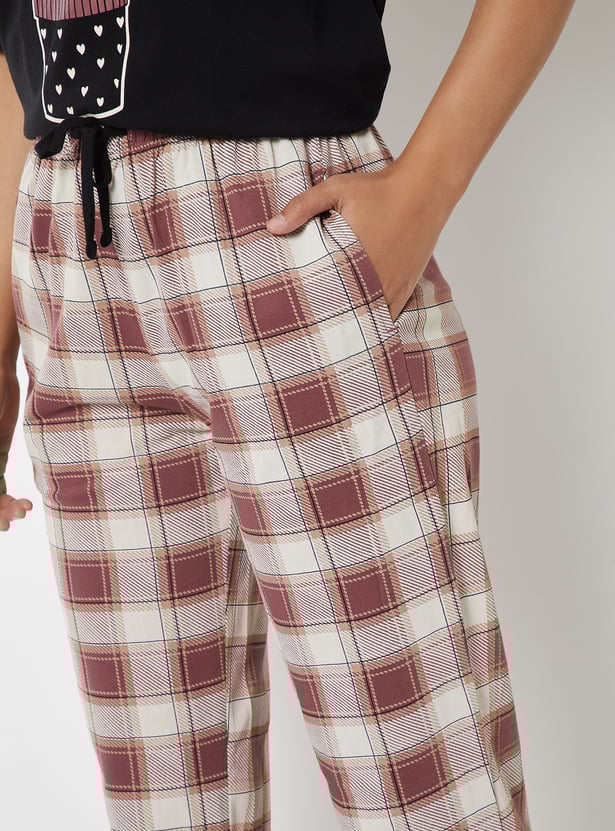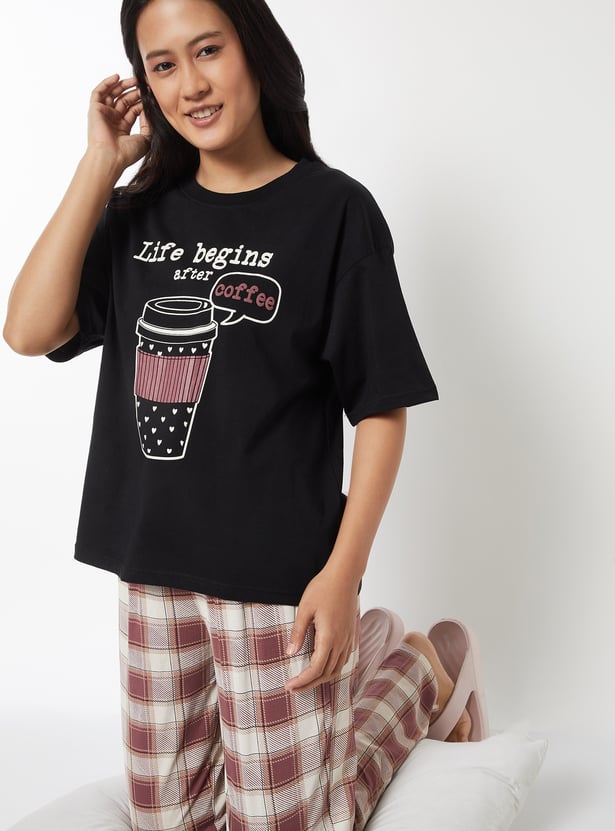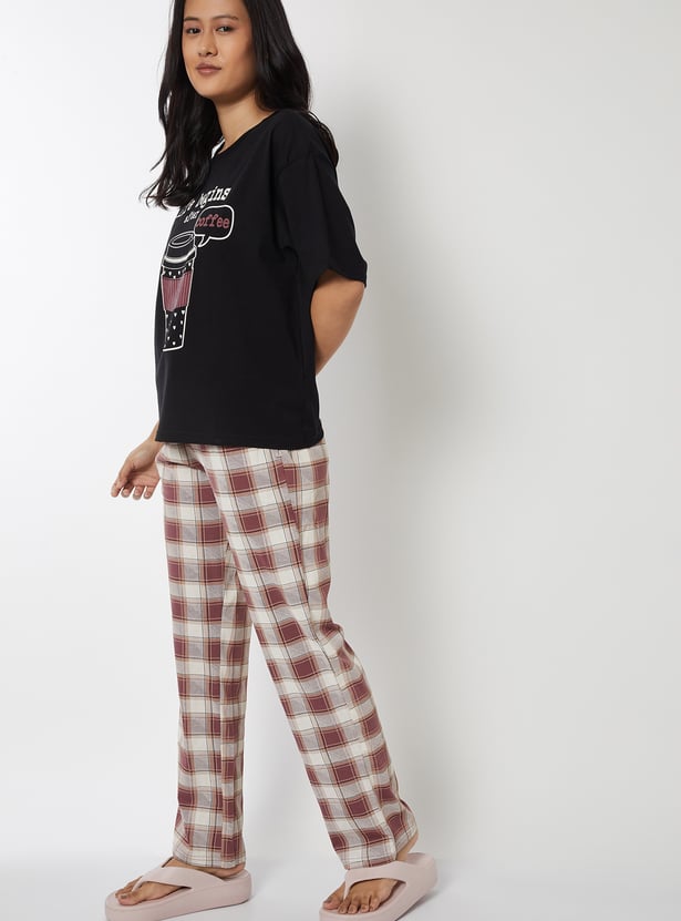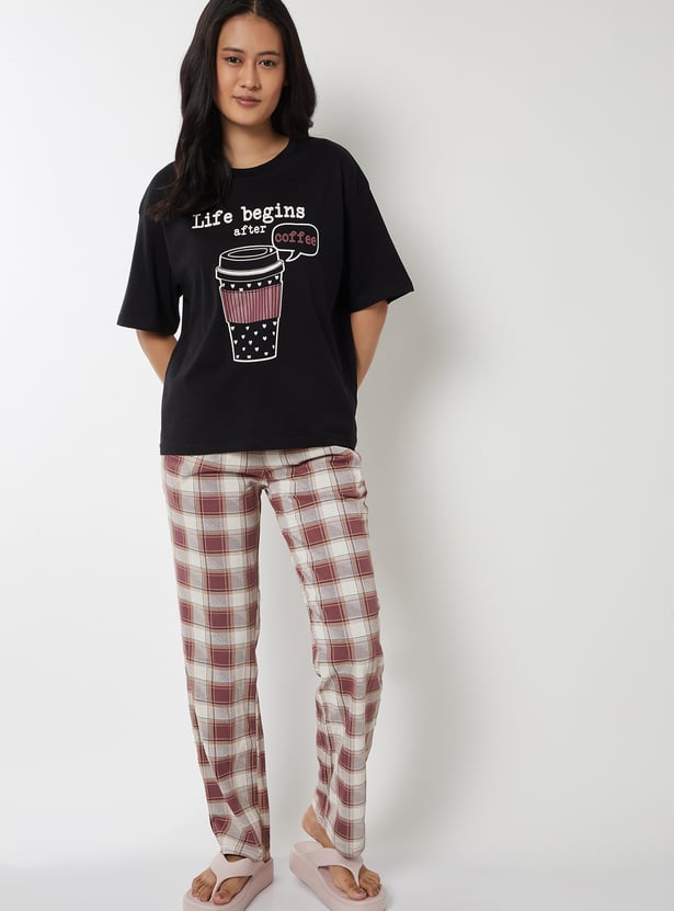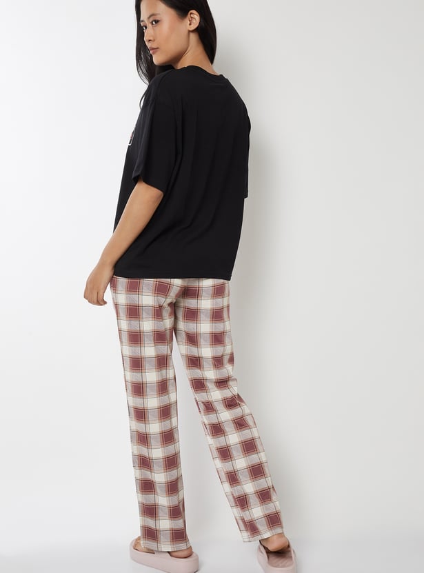 Unwind in comfort with this printed PJ set. It features a printed T-shirt with a round neck and half sleeves, paired with checked pyjamas designed with a drawstring closure and pockets for a snug fit. Model Size :