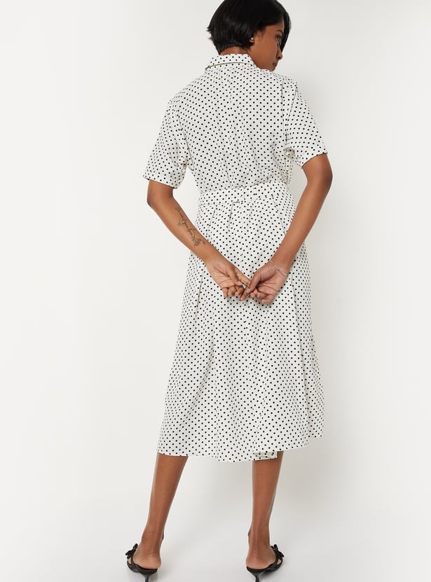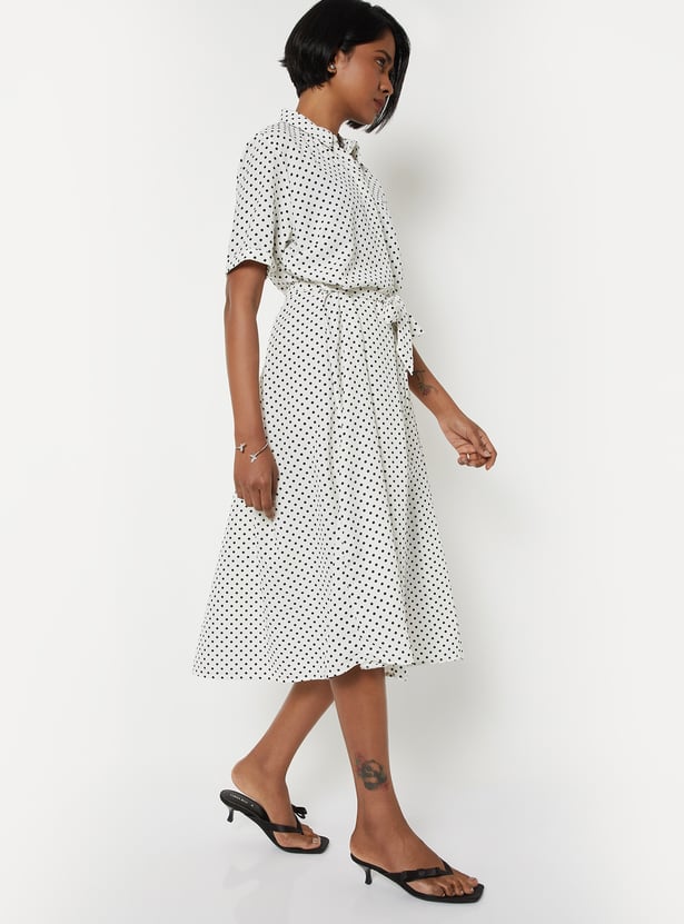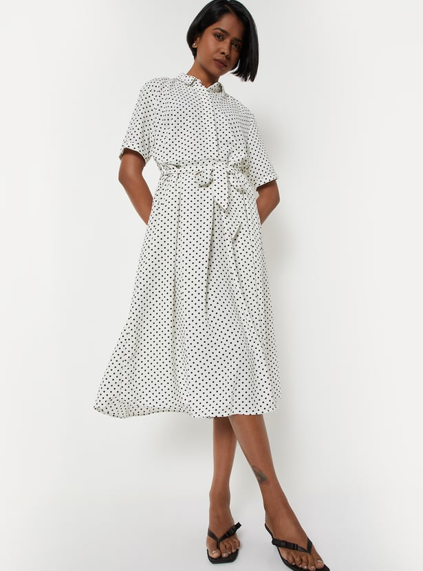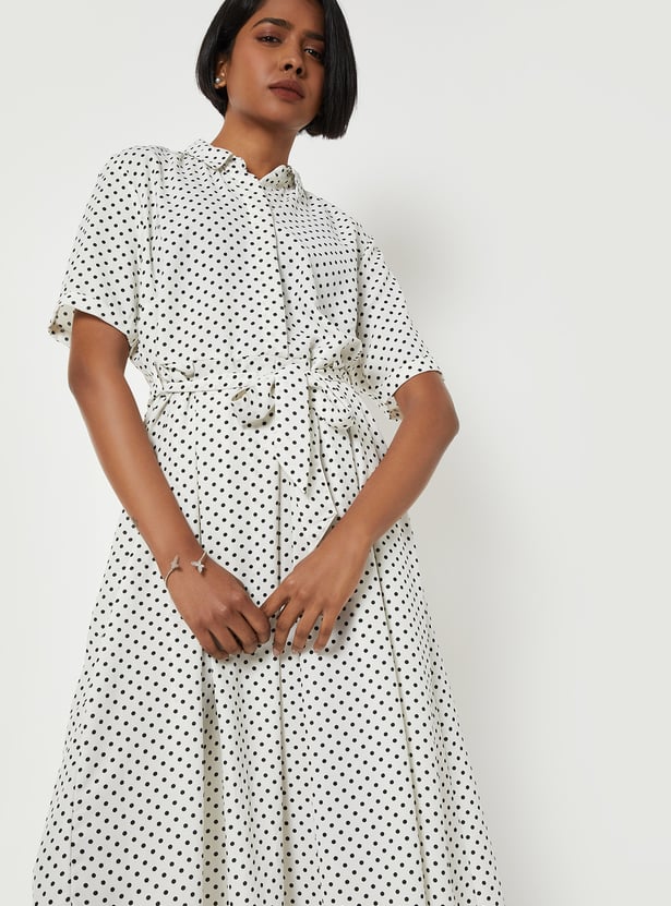 Step out in effortless elegance with this printed shirt dress, designed to blend structure with ease. Featuring a sharp spread collar, classic button placket, breezy half sleeves, tie-up waist, and a flattering midi length, it’s the perfect balance of chic and comfortable.