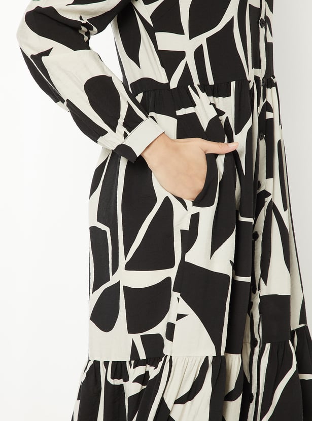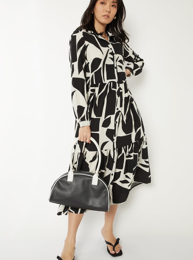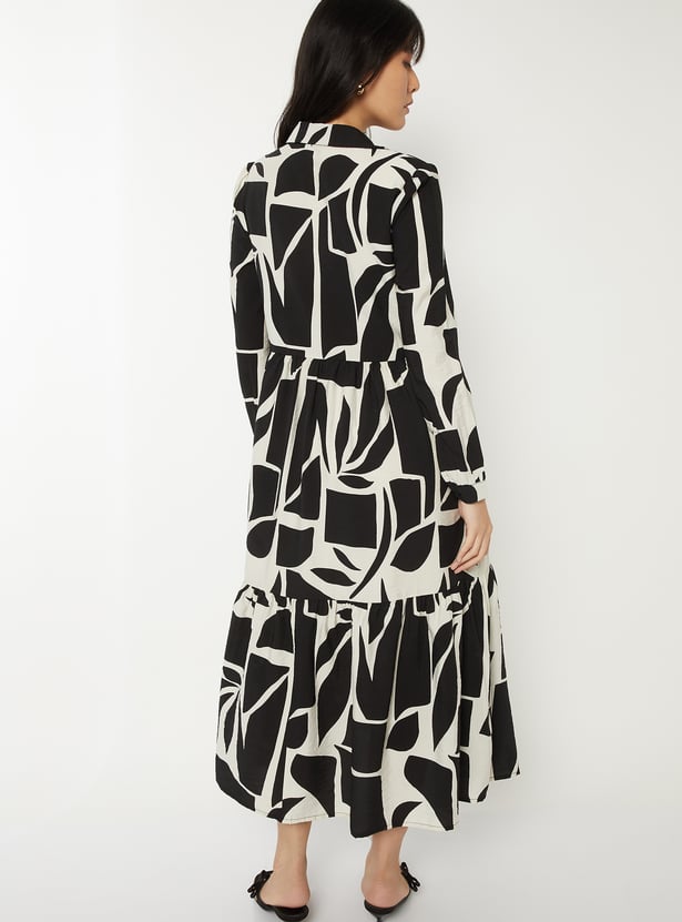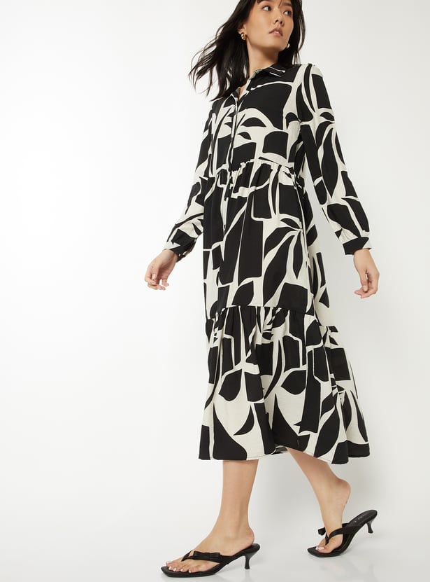 Elegant and versatile, this printed shirt dress features a classic spread collar, a button placket, and full sleeves with button cuffs for a polished finish. Designed in a flattering midi length, it blends comfort with sophistication.