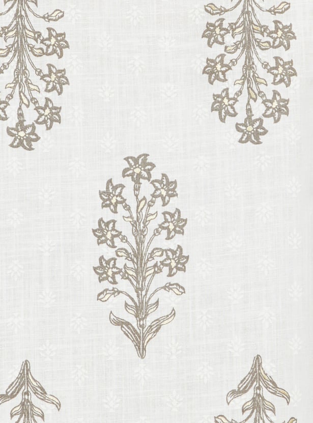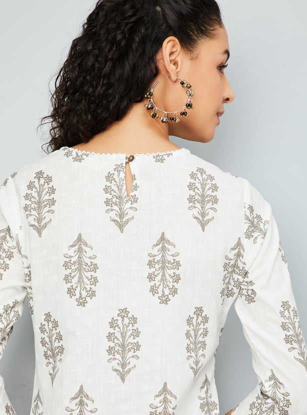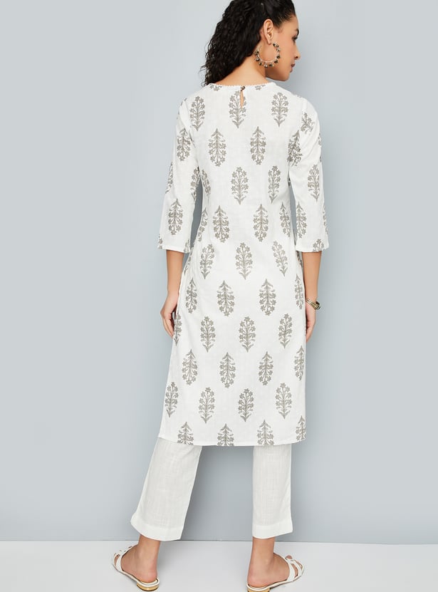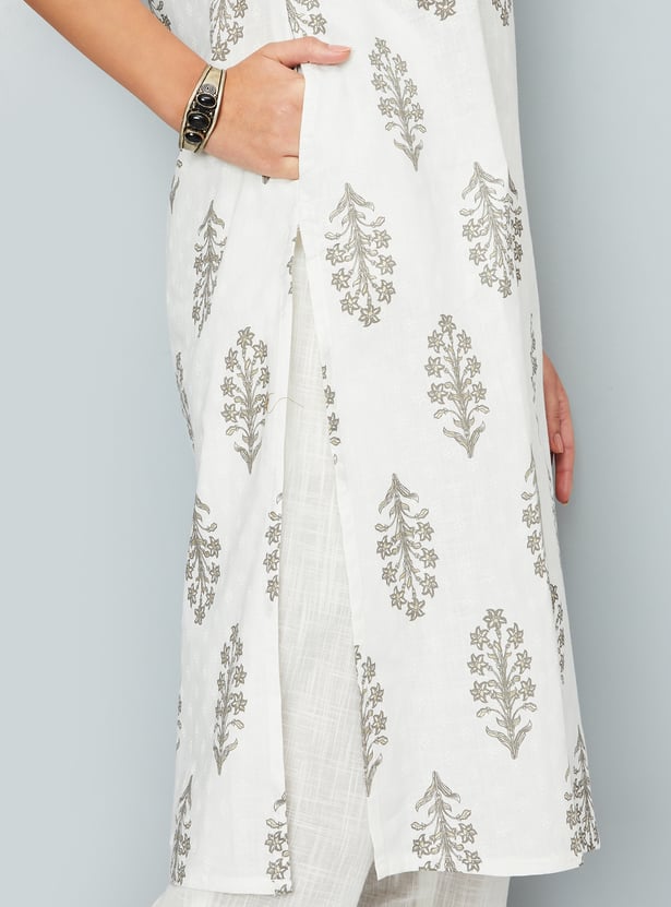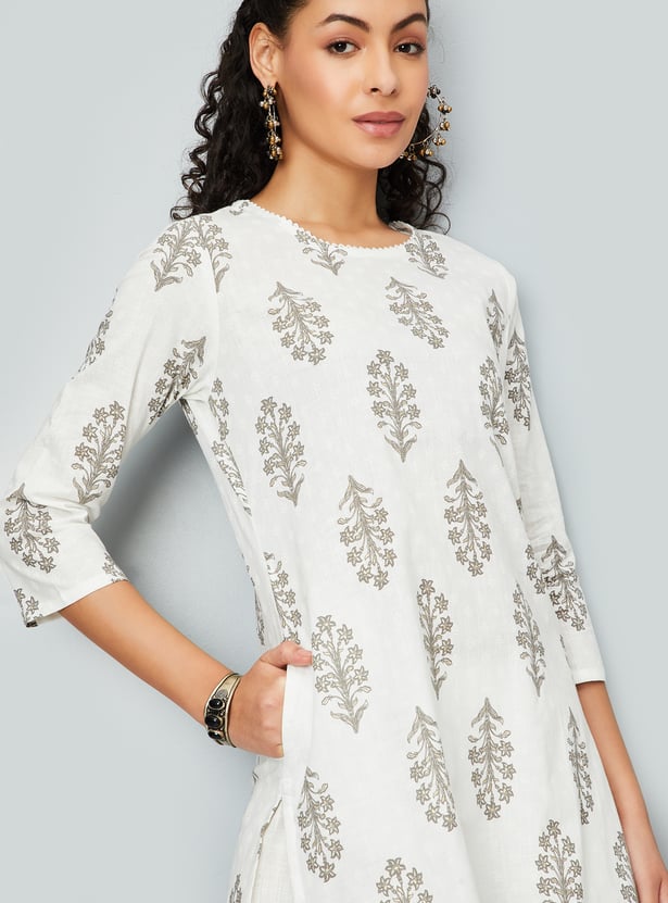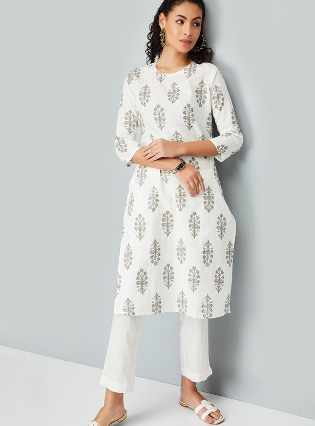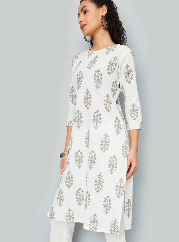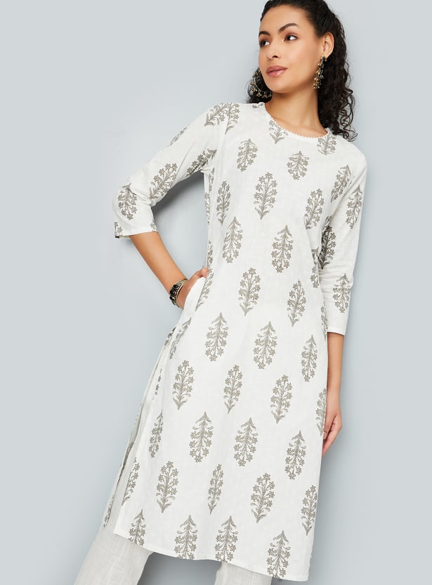 Achieve effortless elegance with this straight kurta, adorned with a charming floral print. It features a round neckline, three-quarter sleeves, and a convenient pocket, with a graceful calf-length cut that combines both grace and style in one stunning piece.