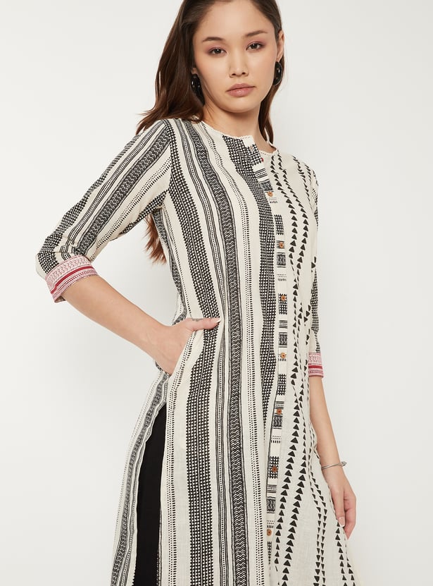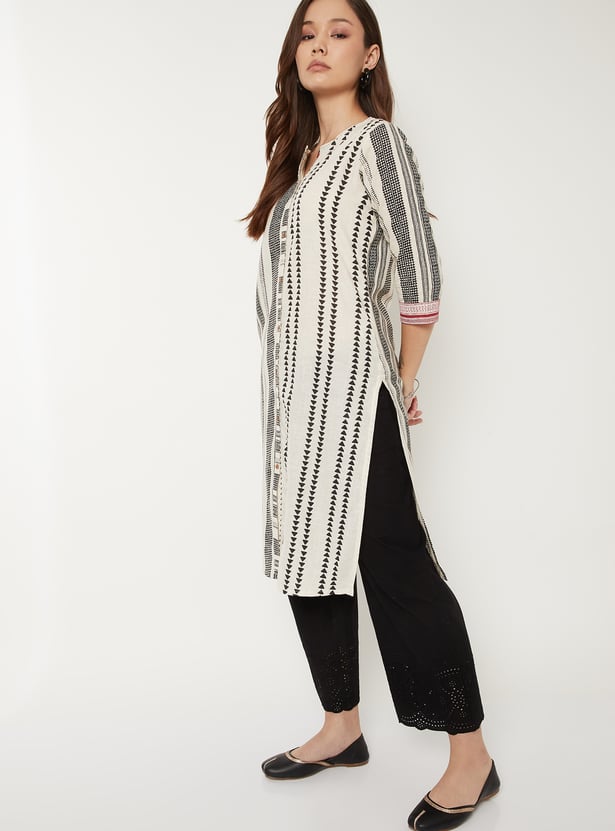 This printed straight kurta features a round neck, a neat button-down front, and 3/4th sleeves for a polished everyday silhouette. The knee-length cut and a functional side pocket add ease and practicality to its vibrant design.