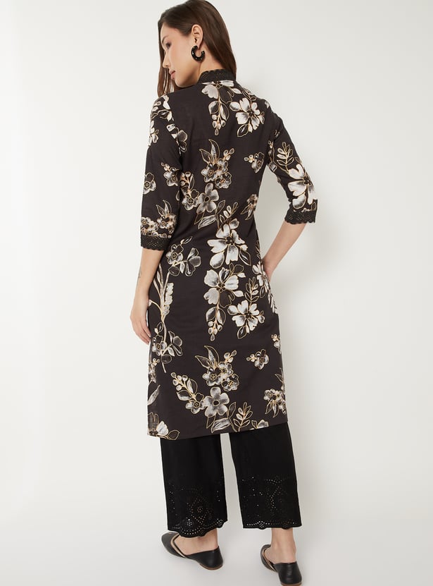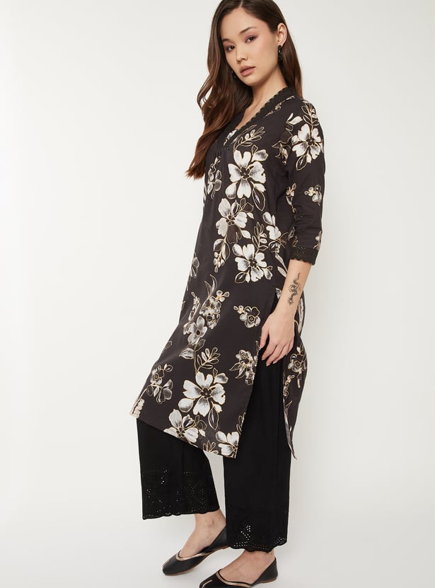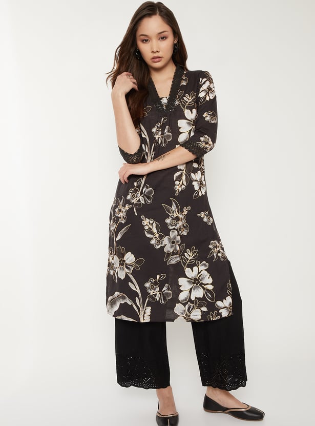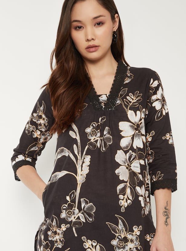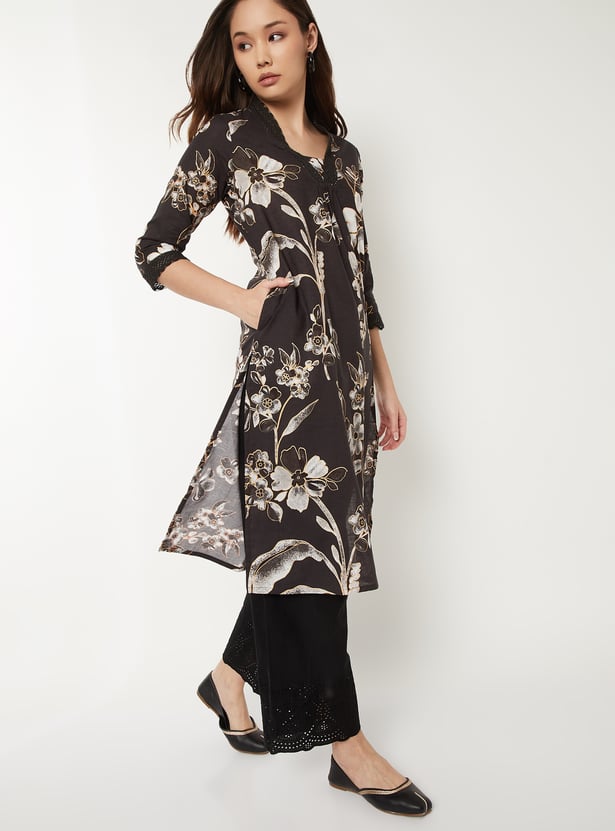 This all-over printed straight kurta features a flattering V-neck adorned with delicate crochet lace and 3/4th sleeves for a soft, feminine finish. Its easy, regular silhouette and functional side pocket make it a stylish yet practical everyday staple.