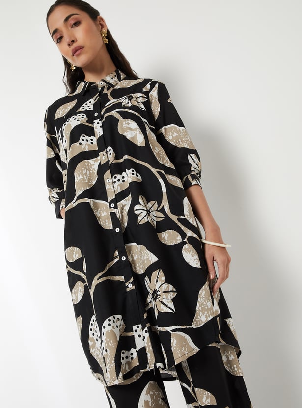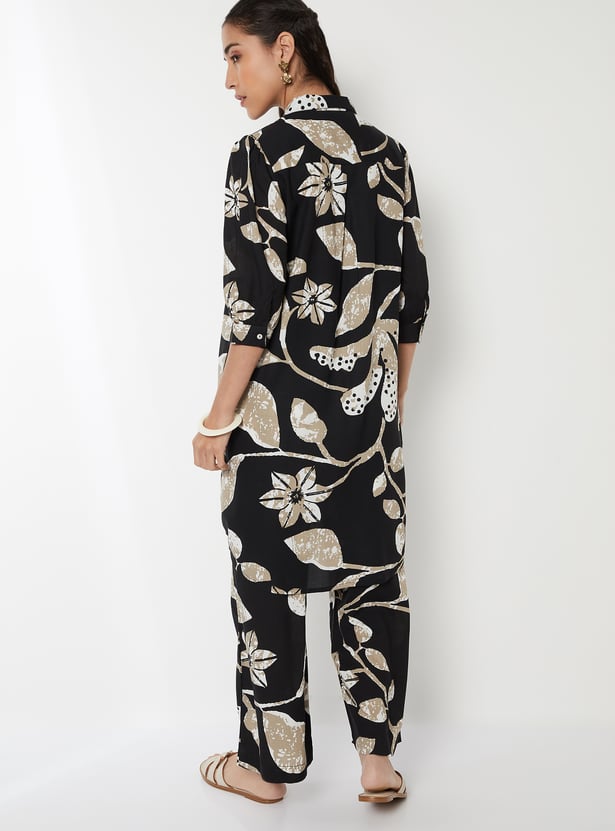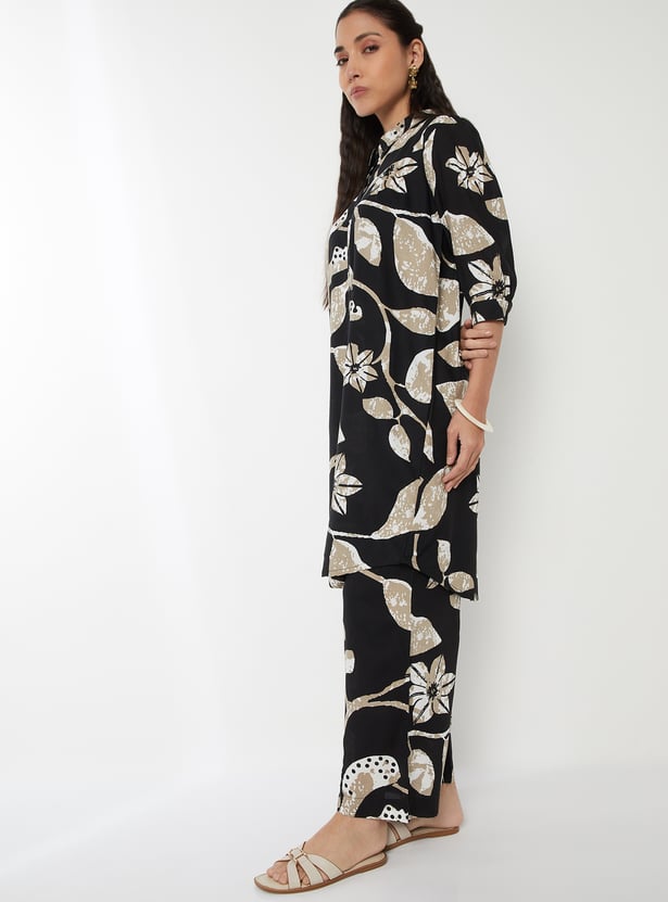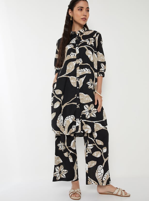 Step into effortless elegance with this printed straight kurta set. The kurta is designed with a spread collar, button placket, 3/4th sleeves, and side slits for ease of movement and a polished silhouette. It’s paired with palazzos featuring an elasticated waist, blending comfort with contemporary style.
