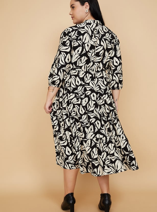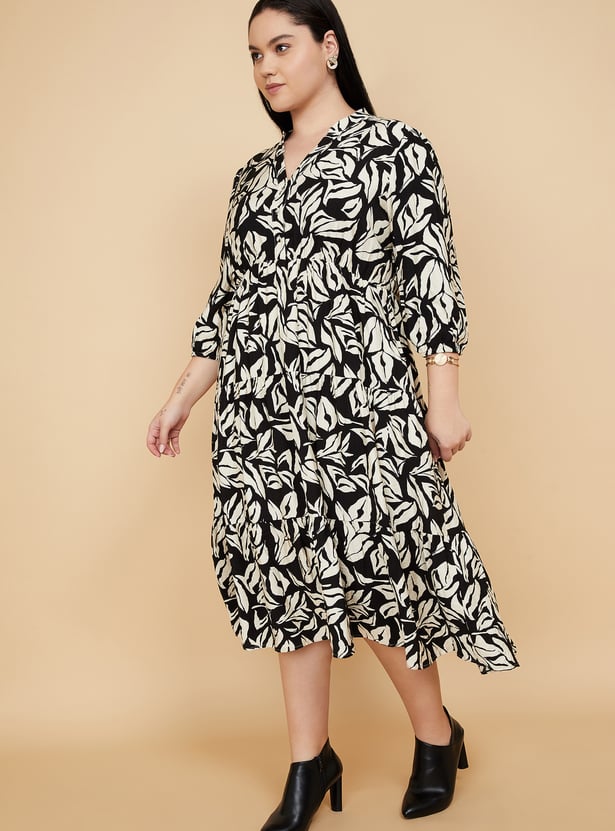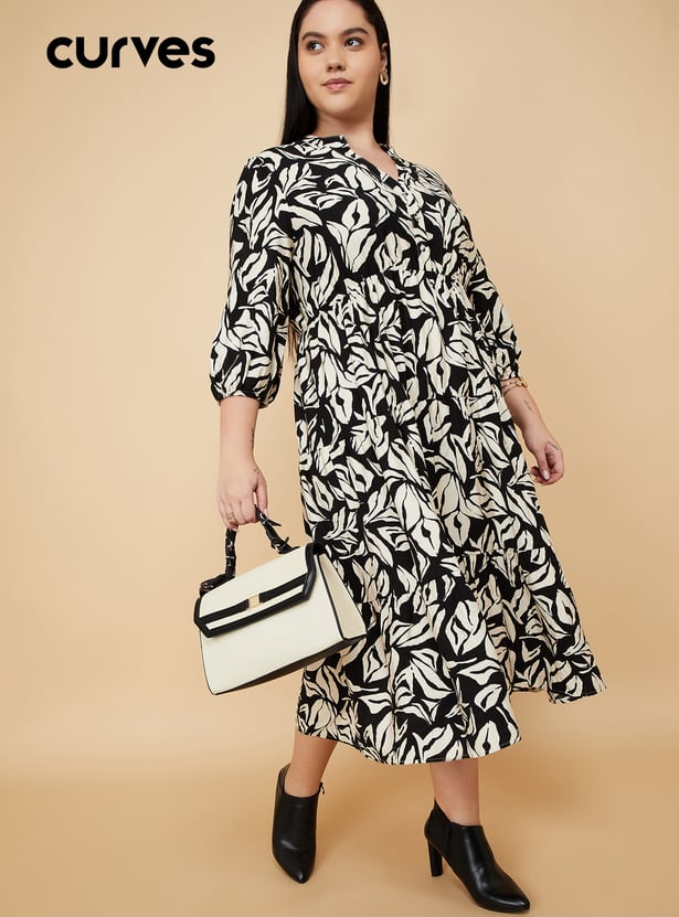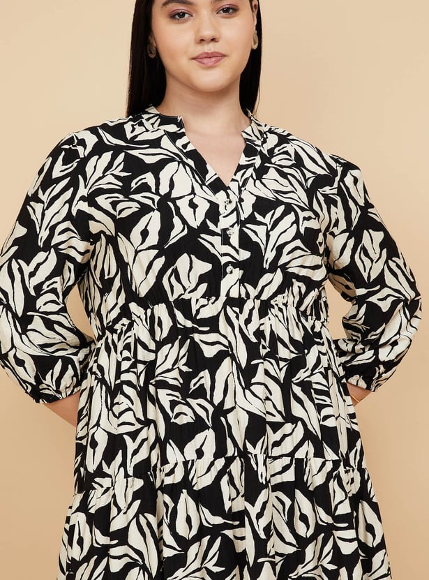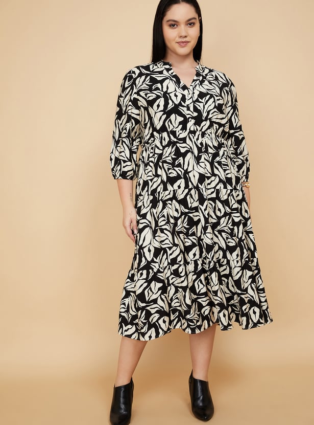 Step out in effortless charm with this printed tiered dress, featuring a smart band collar and 3/4th sleeves for a chic, versatile look. Model Size :