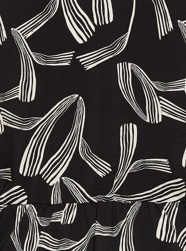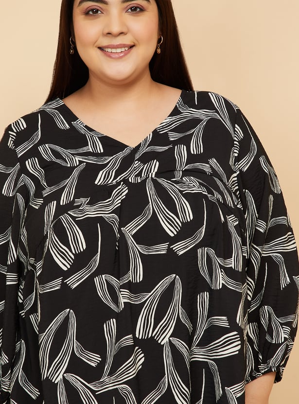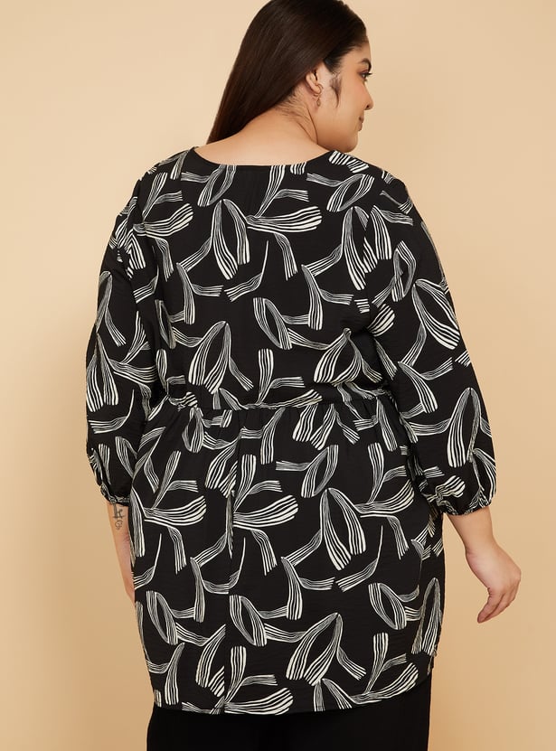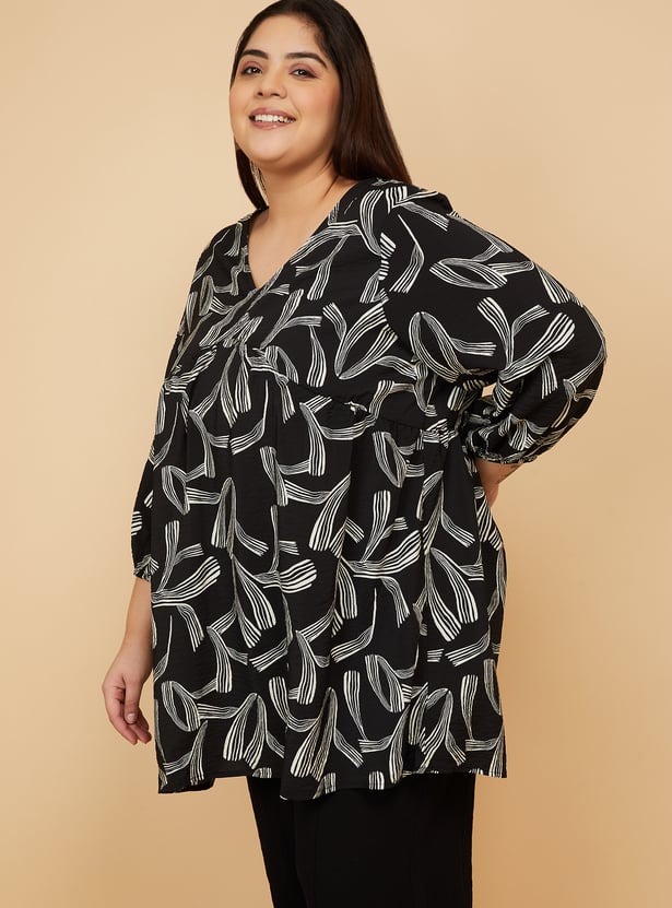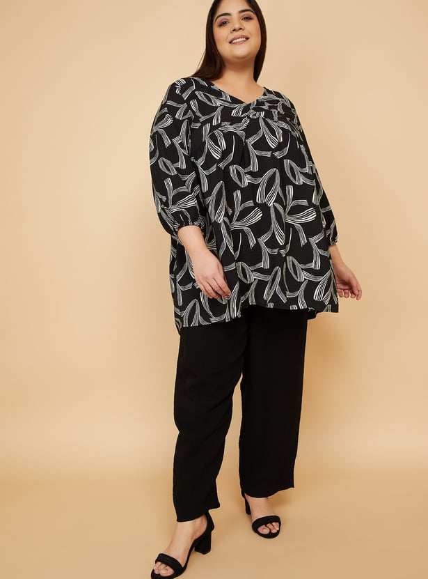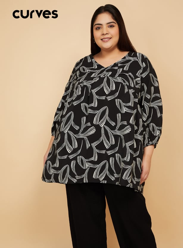 This printed tunic features a flattering V-neck and 3/4th puffed sleeves, blending ease with a soft, feminine silhouette. The lively print adds charm and versatility, making it a perfect pick for elevated everyday dressing. Model Size :