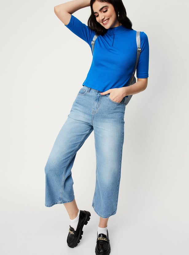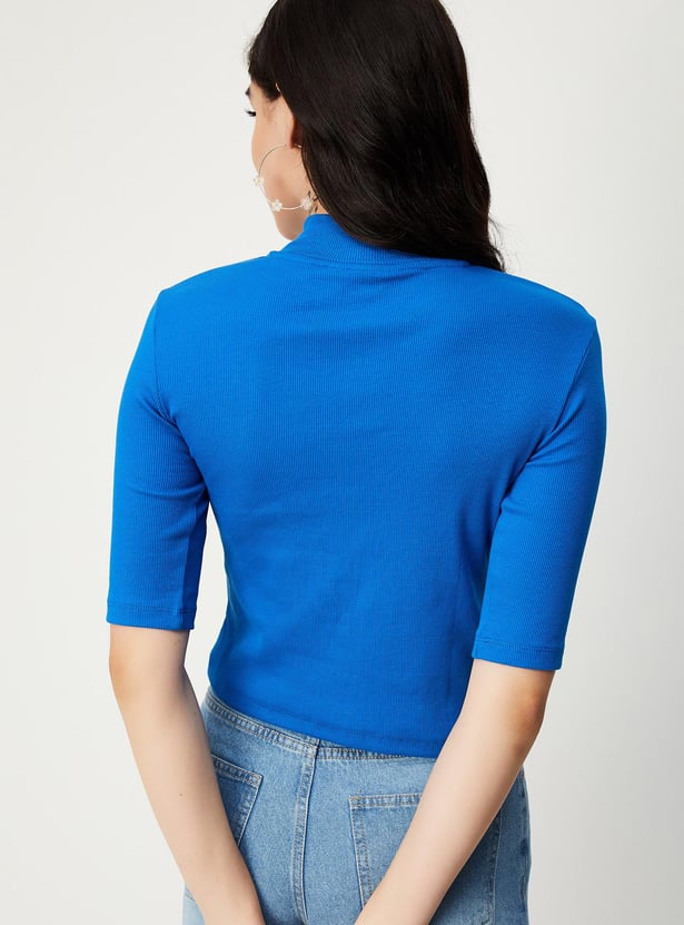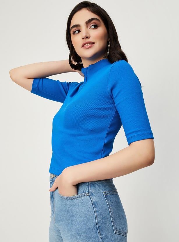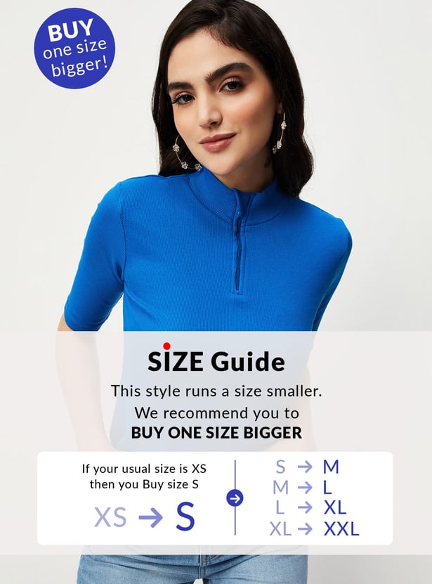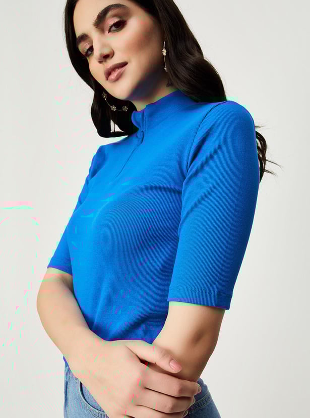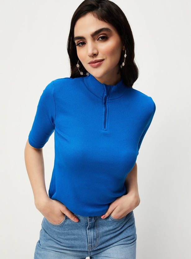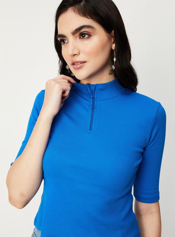 Switch up your style by adding this ribbed top to your casual collection. Designed with a mock collar, zip closure and half sleeves, it calls to be styled with a pair of trousers and sneakers to elevate the outfit.