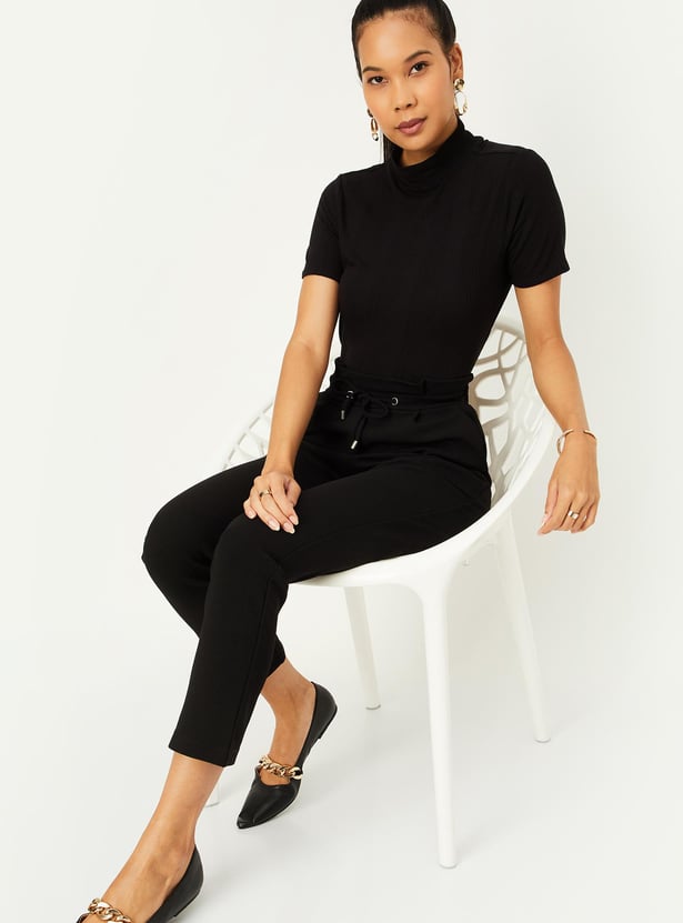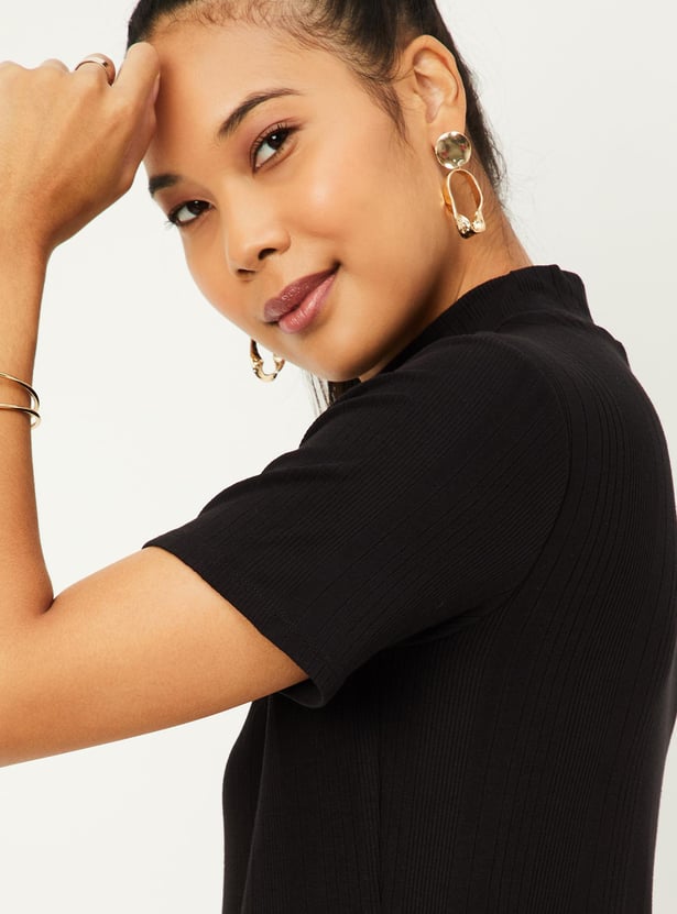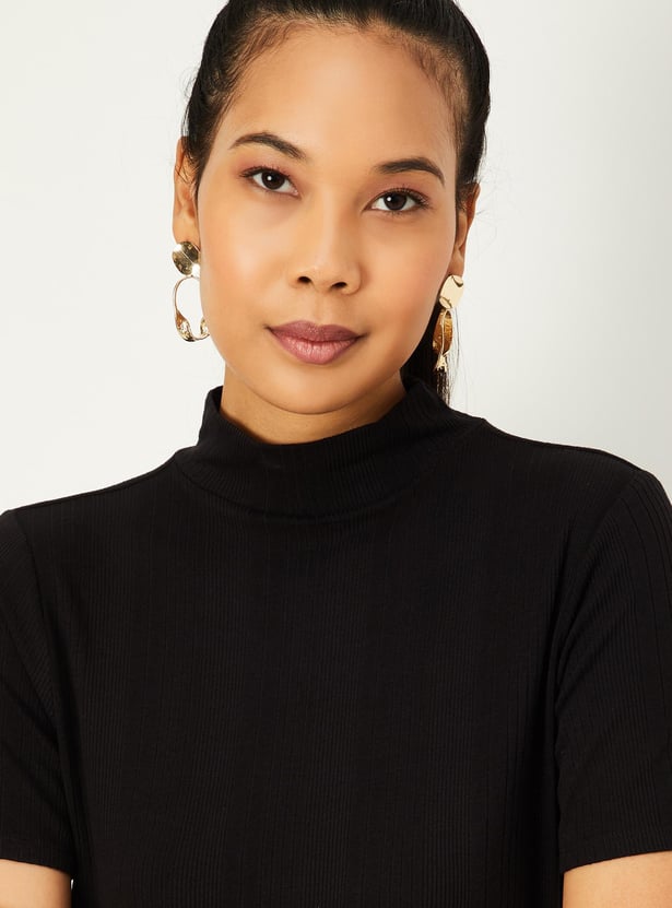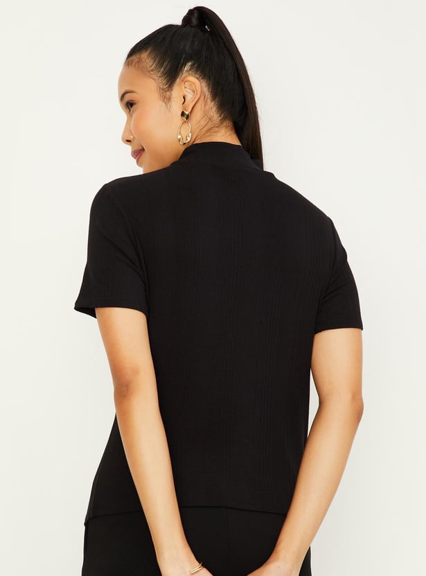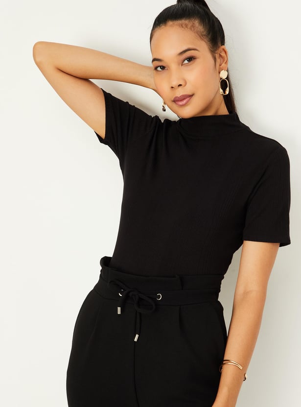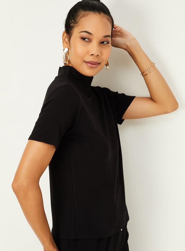 This ribbed t-shirt with half sleeves and a high neck, gives trendy style to simply boost your casual look. Style it with a pair of jeans and sneakers for a stylish look.