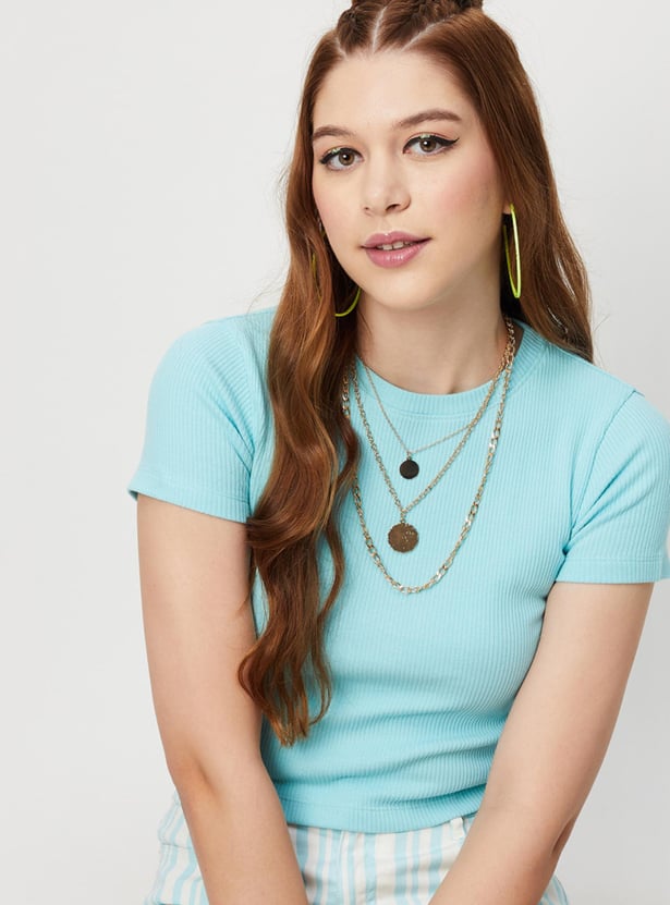 Up your style quotient with this casual top with a knit surface, a round neckline, and short sleeves. Team up this top with denim shorts and sneakers to complete your everyday ensemble.