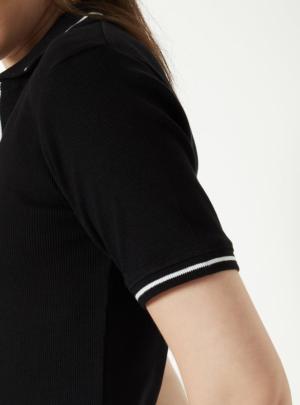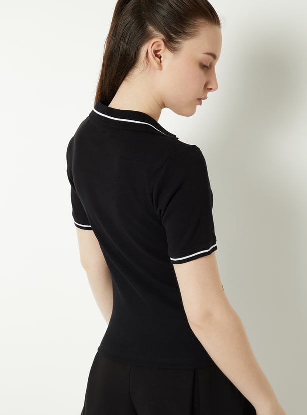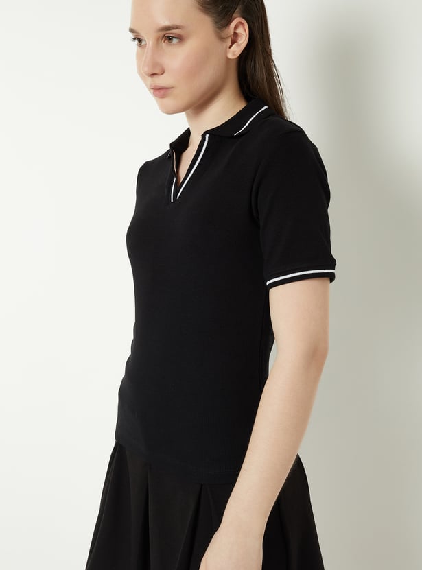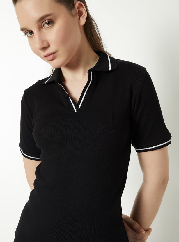 Upgrade your workout wardrobe with this slim-fit T-shirt, featuring a classic Johnny collar, ribbed detailing, and eye-catching contrast trim. The half sleeves and straight hem offer a clean, flattering silhouette.