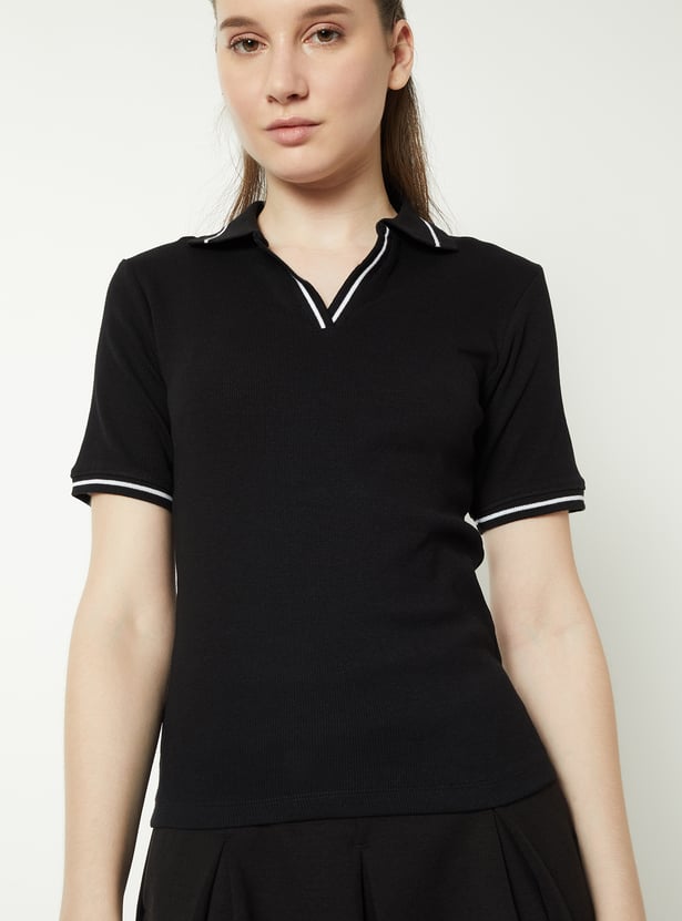 Women Ribbed Slim Fit Johnny Collar T-shirt