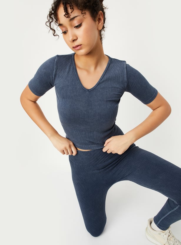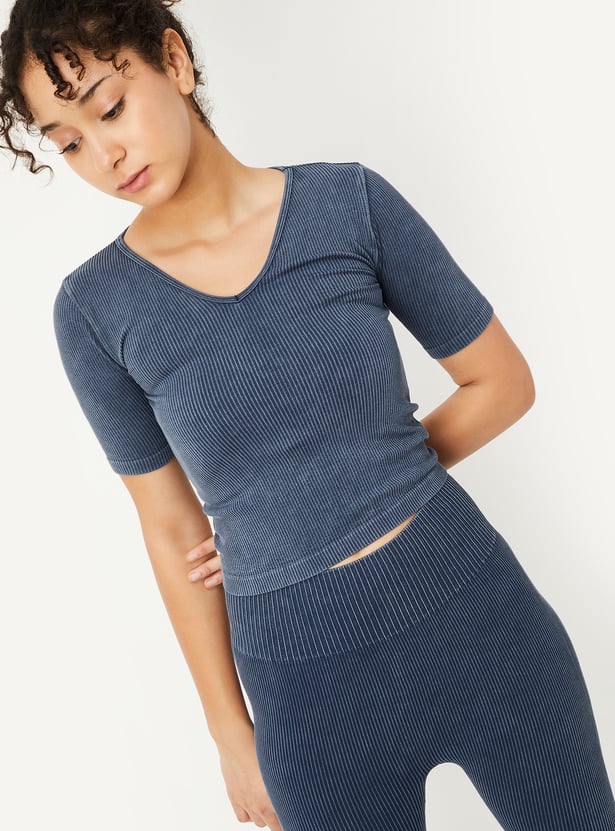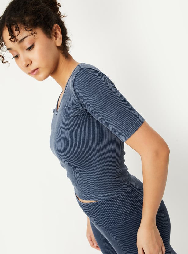 Elevate your workout wardrobe with this ribbed sports T-shirt, designed with a washed surface for a modern look. The v-neck and half sleeves provide a comfortable, stylish fit, making it perfect for any active day.
