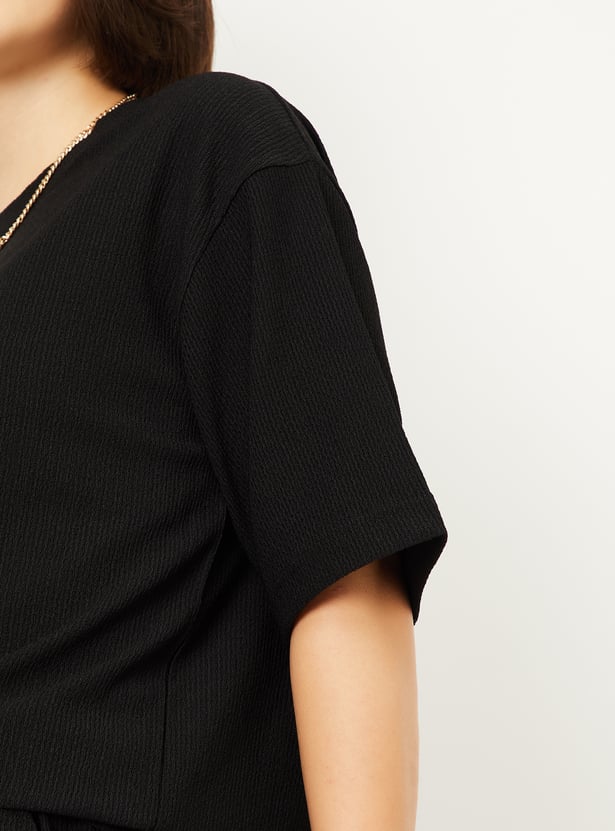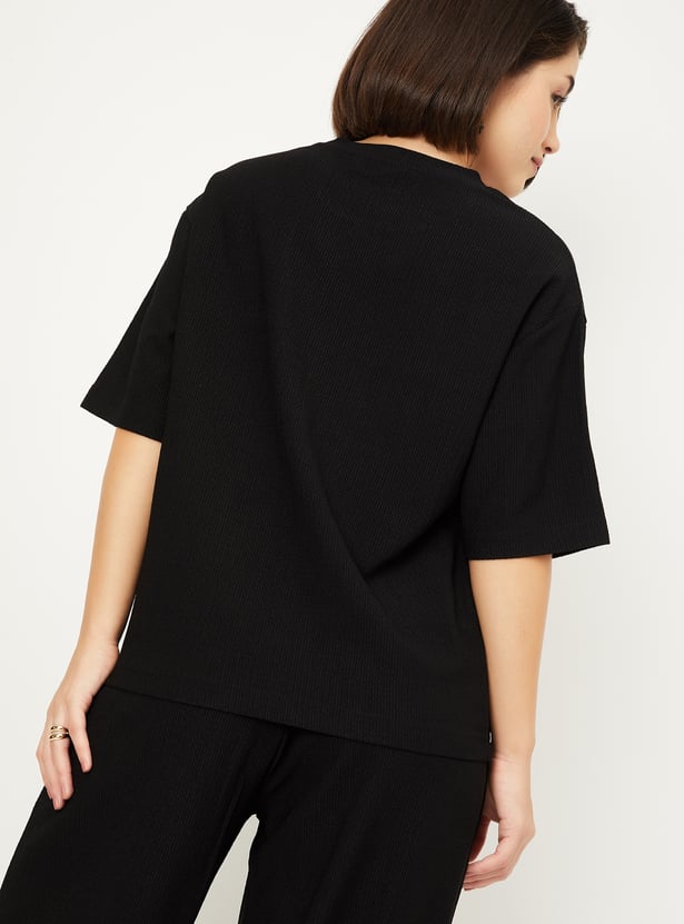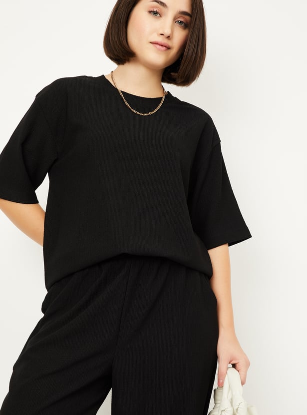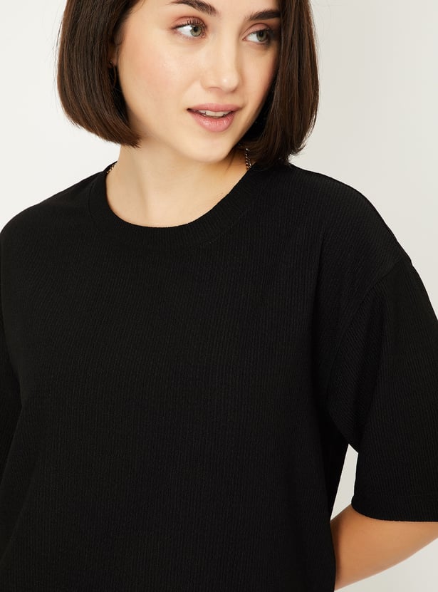 This ribbed t-shirt features a relaxed drop shoulder design and half sleeves, offering both comfort and effortless style. The round neck adds a classic touch, making it perfect for casual, everyday wear.