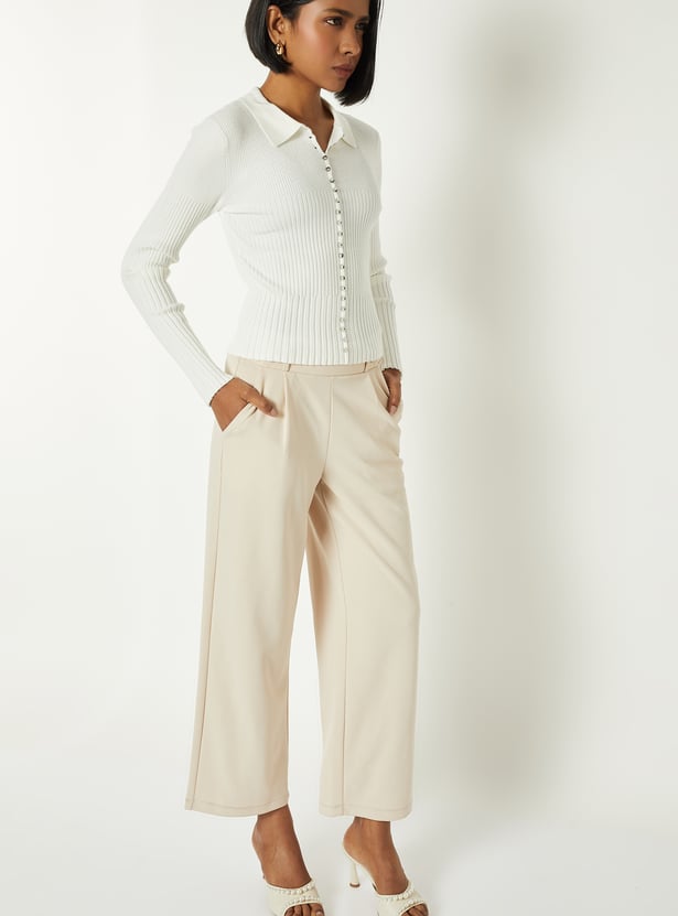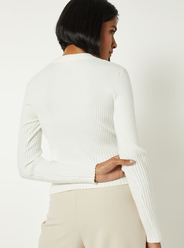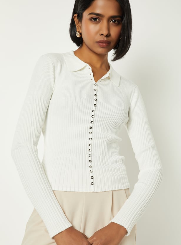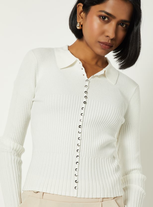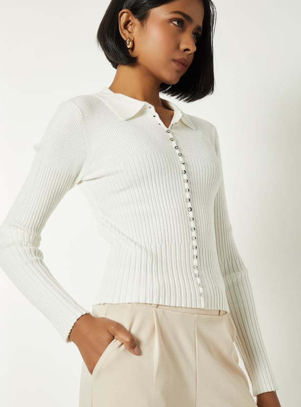 Elevate your everyday style with this ribbed top, designed with a flattering spread collar, full sleeves, and delicate embellished detailing. A chic blend of comfort and sophistication.