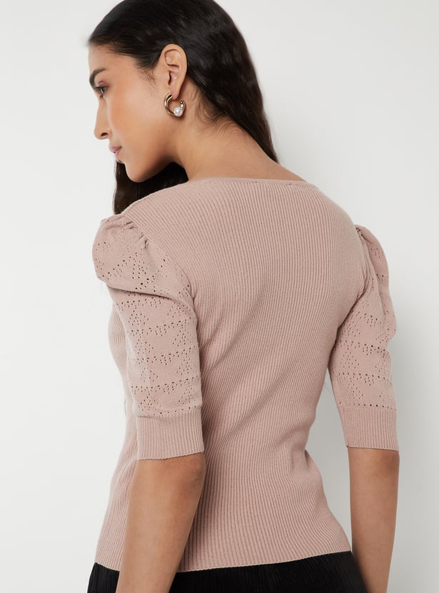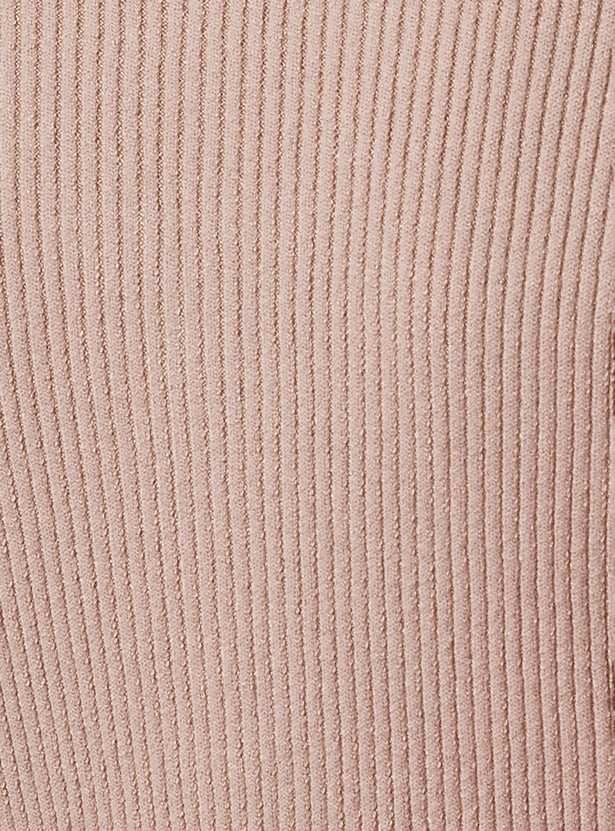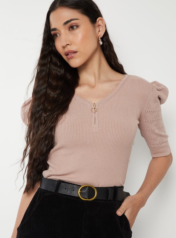 This top features a flattering V-neck with a sleek zip detail and half sleeves, giving it a modern edge. The ribbed texture adds definition, making it a chic upgrade to everyday basics.