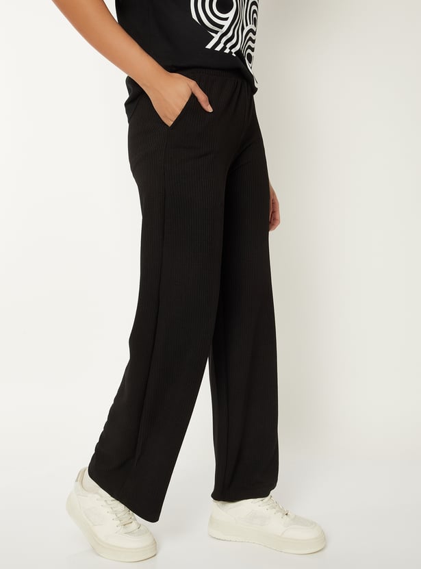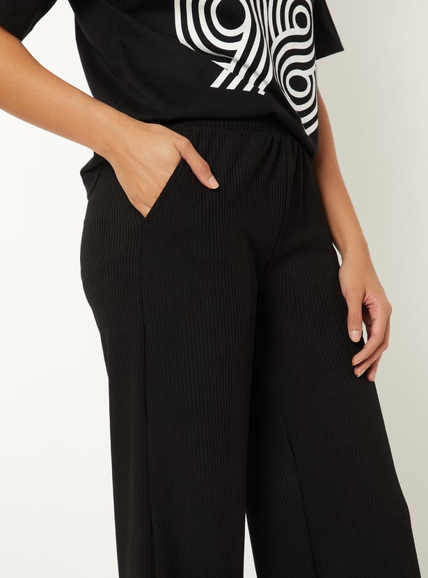 Stay comfortable and effortlessly stylish with these ribbed wide-leg track pants, featuring an elasticated waist for a flexible fit. The ribbed texture adds a modern touch to this relaxed silhouette.