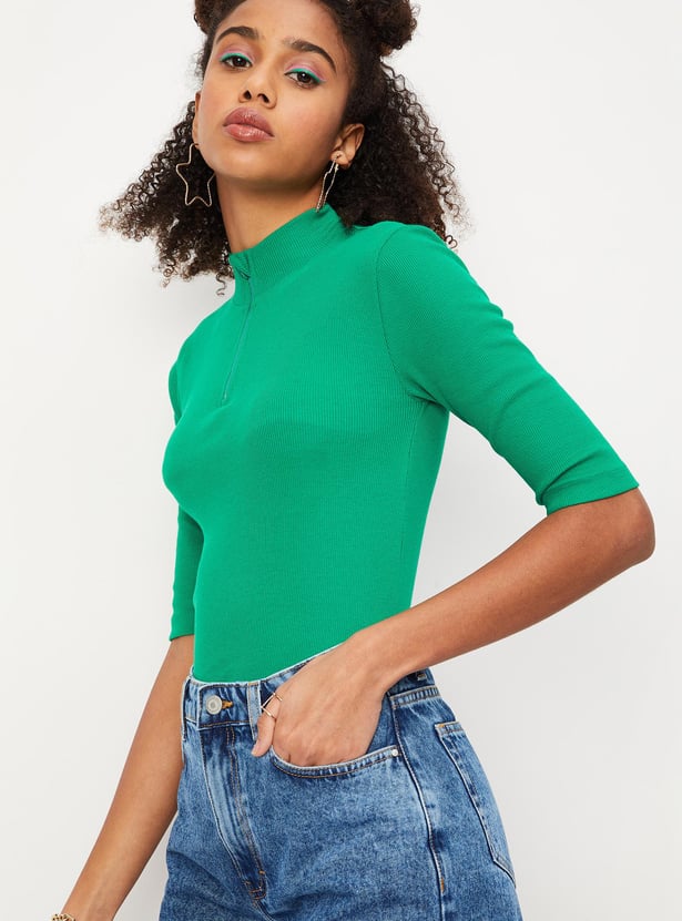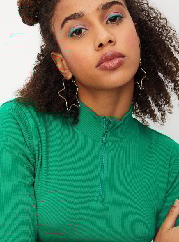 Women Ribbed Zip Crop T-shirt