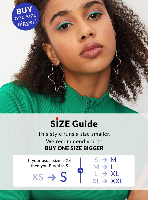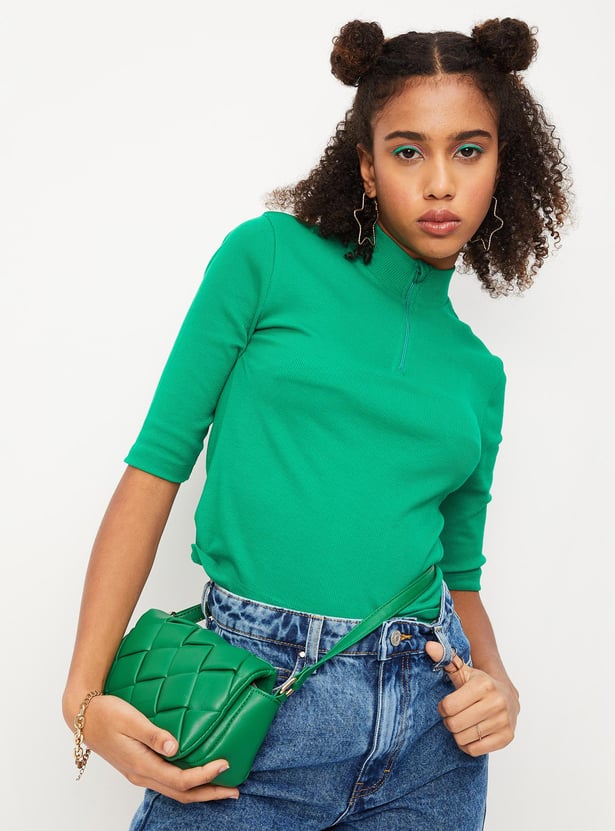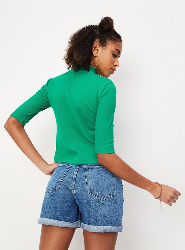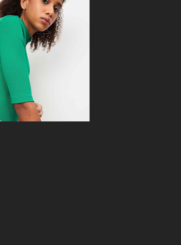 Add versatility to your wardrobe with this T-shirt that is highlighted with ribbed detailing. It features a mock neck, short sleeves, a zip placket, and a cropped length. Style this tee with jeans and sneakers to ace the look.