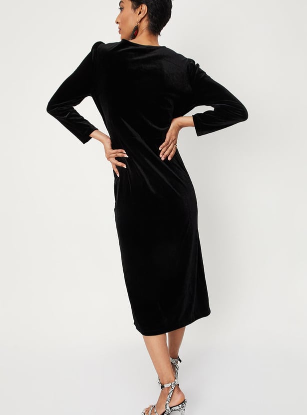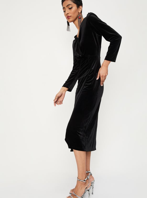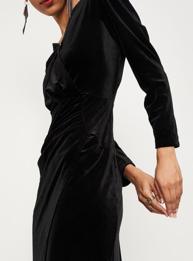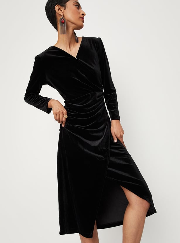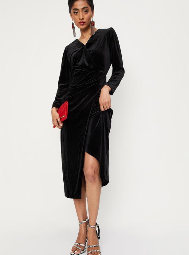Look party ready in this mid-length velvet dress. It is crafted in a wrap profile with a surplice neckline, puffed sleeves, and a ruched front. Add a pair of sandals to this dress to make a chic statement.