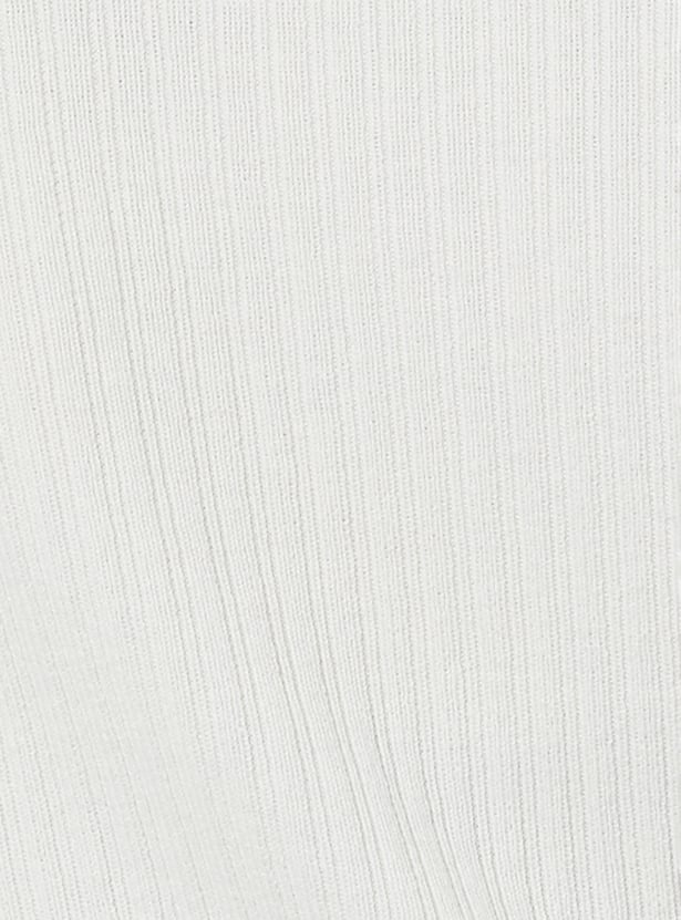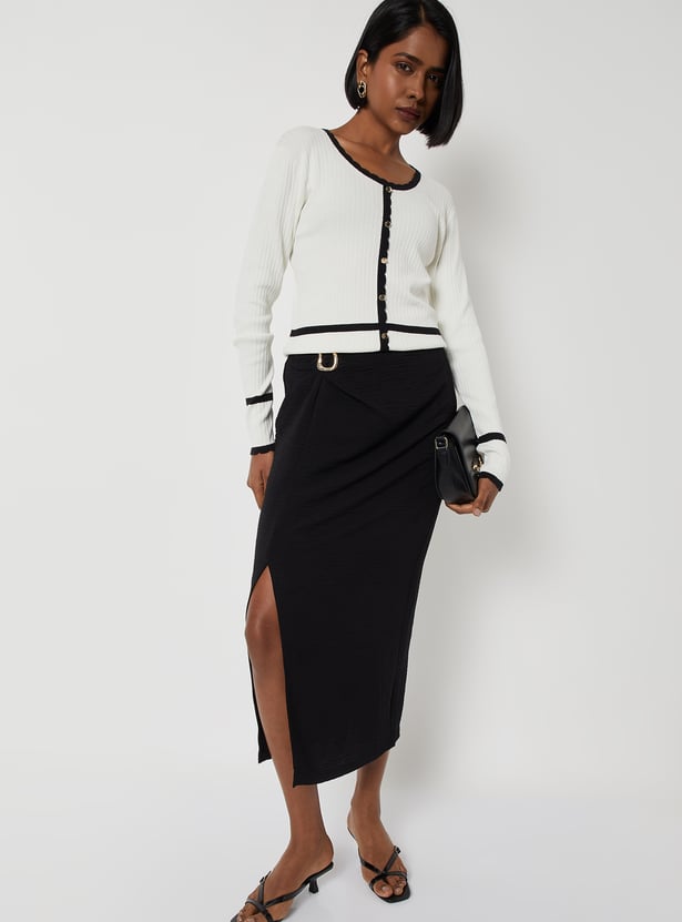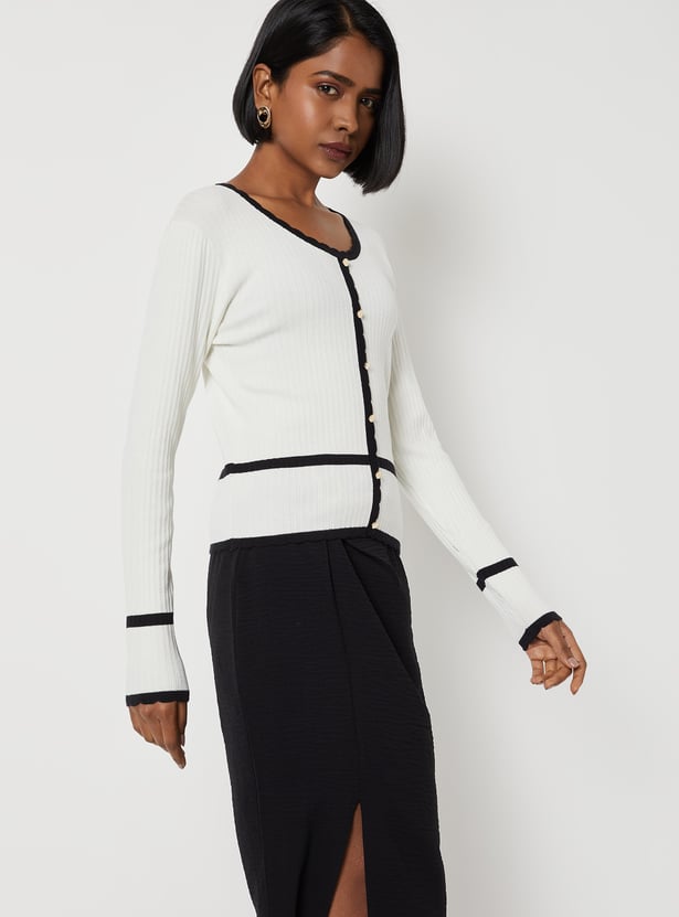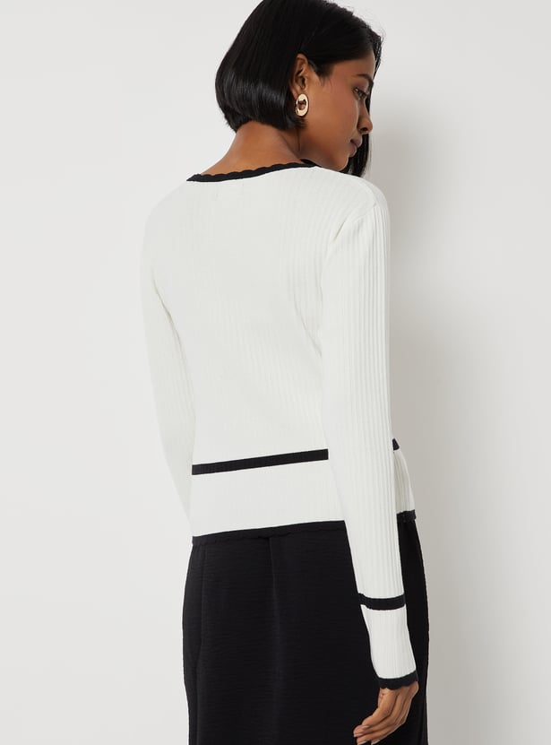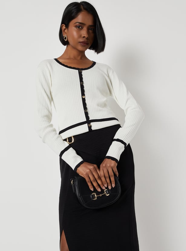 Elevate your everyday style with this top. Crafted in textured knit, it features a round neck and full sleeves for a comfortable fit. Contrast trim with delicate scalloped detailing and metallic button accents adds a refined, stylish touch.