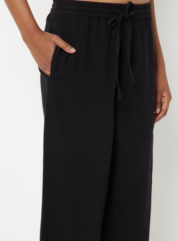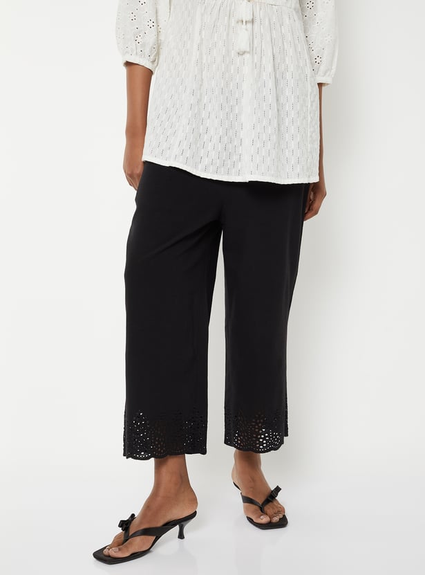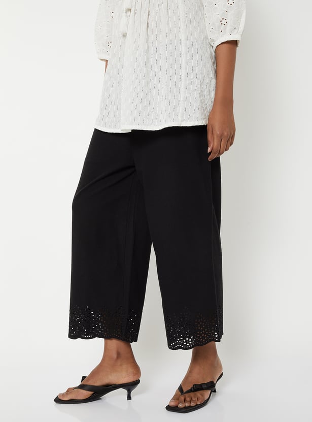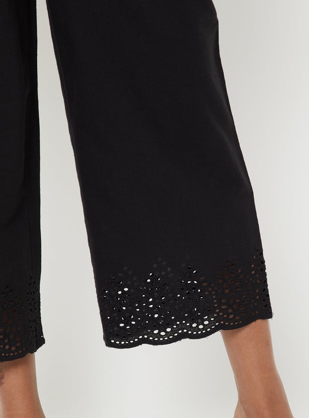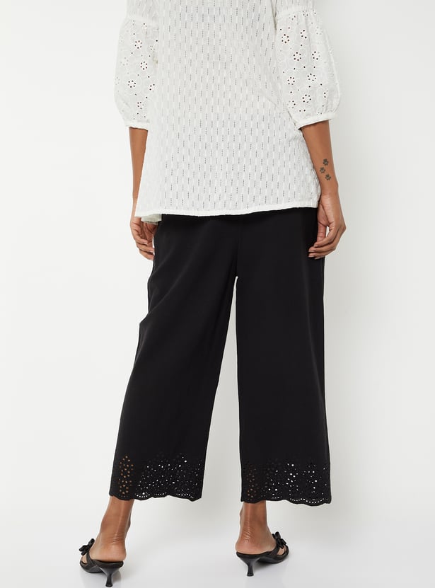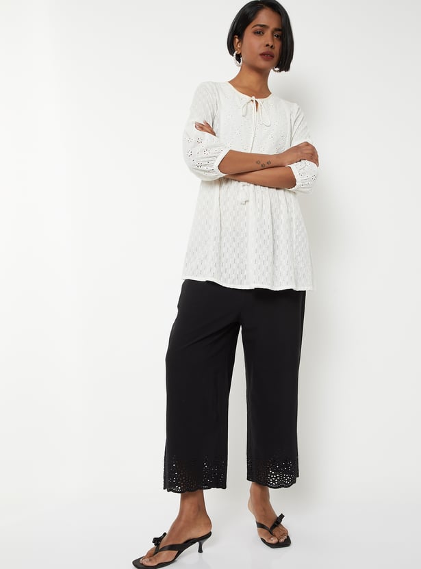 Add breezy elegance to your wardrobe with these Schiffli palazzos. Featuring intricate detailing, a comfortable drawstring closure, and practical pockets, they blend style with everyday functionality.