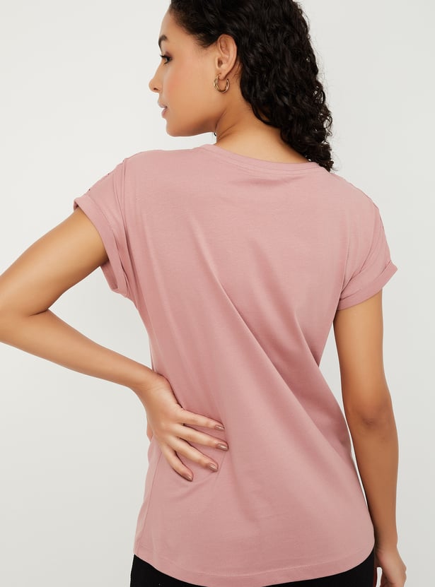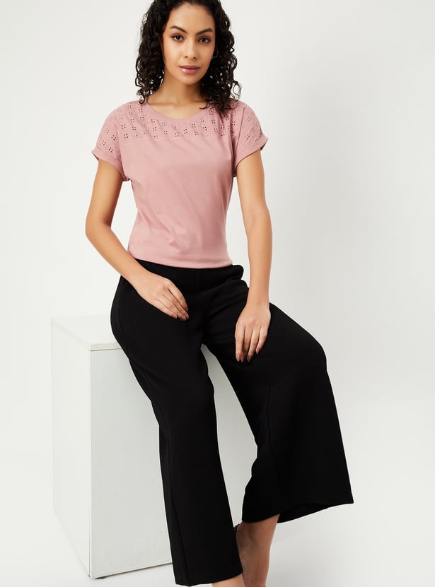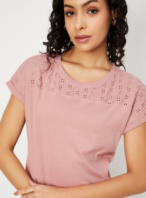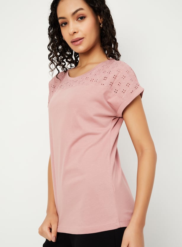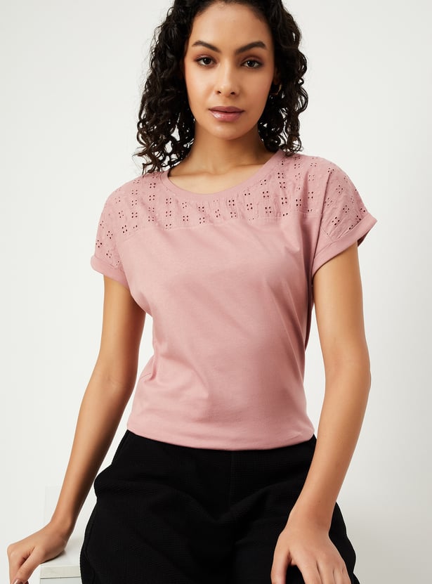 An ideal pick for your casual wardrobe, this top is highlighted with delicate schiffli detailing at the yoke. Featuring a round neck and extended half sleeves, it blends comfort with subtle elegance.