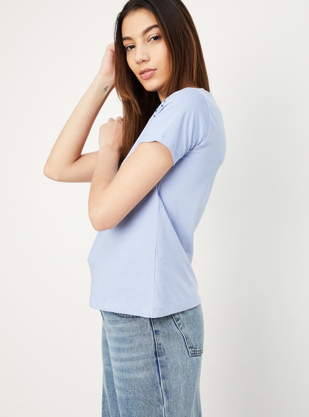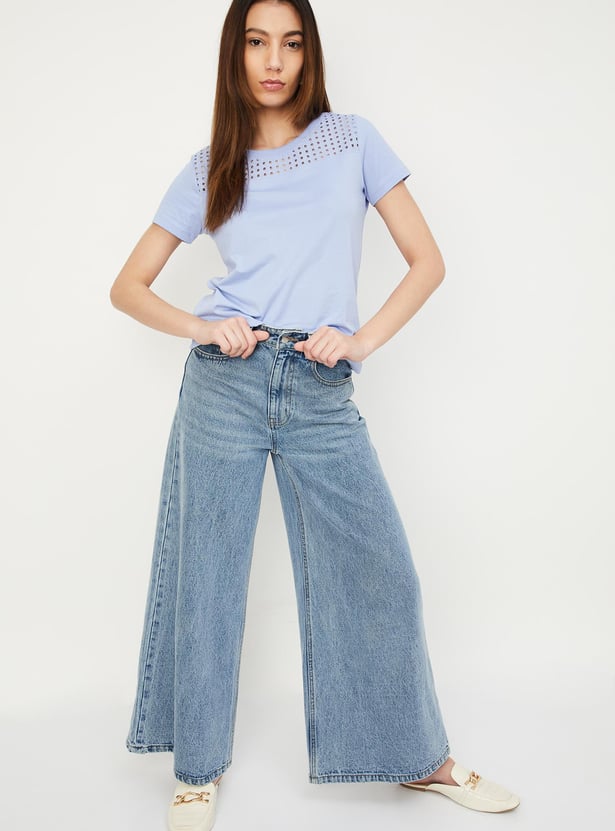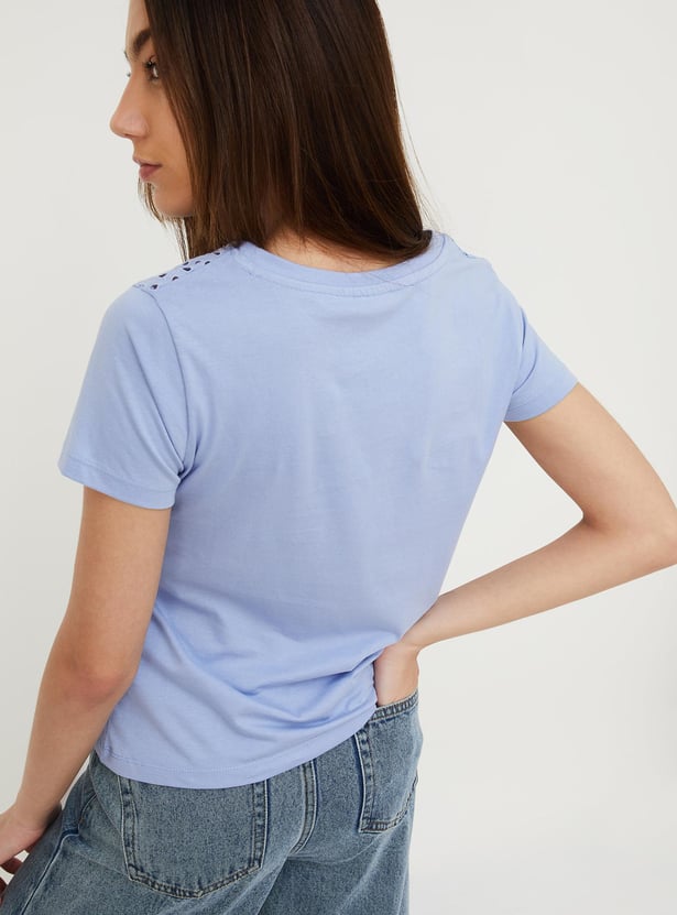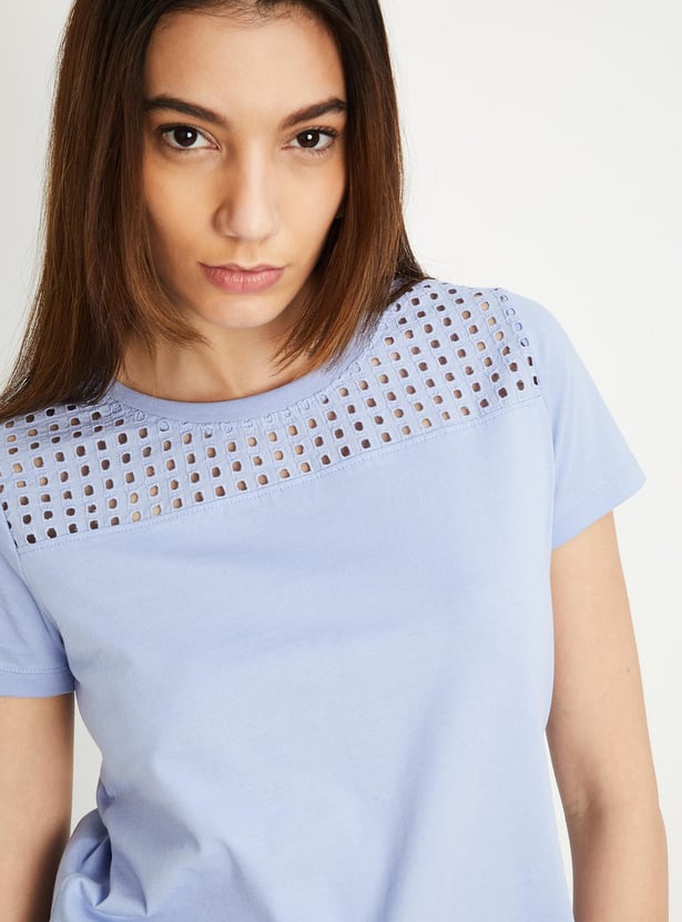Build your casual wardrobe with his T-shirt. It is highlighted with a round neck, short sleeves, and a schiffli embroidered yoke.