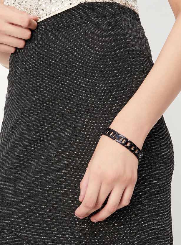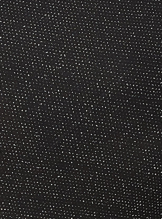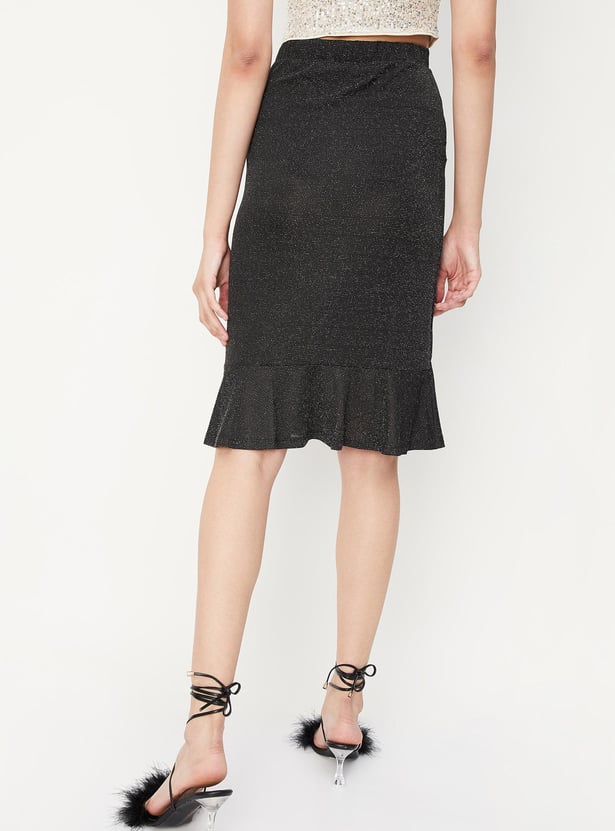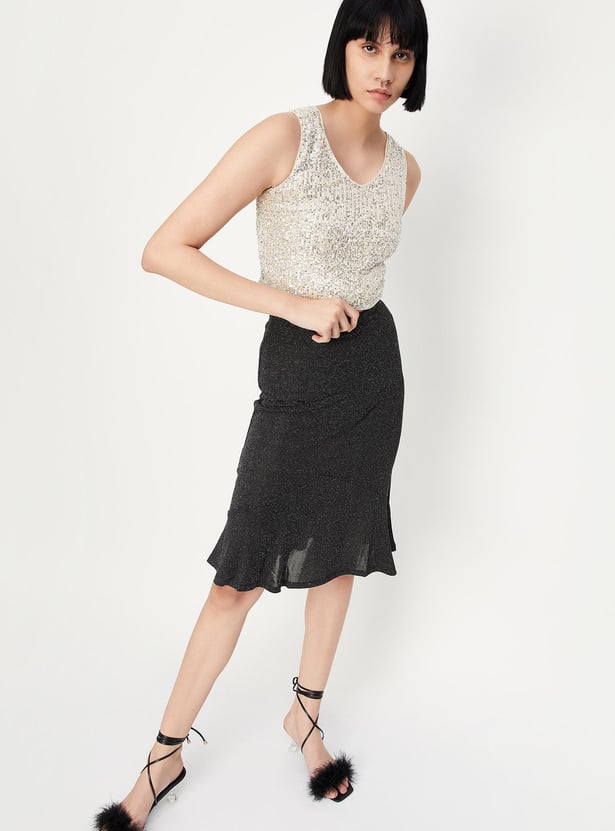 Flaunt your look with this knee length skirt with a shimmery surface. It has gathered details, and a slightly elasticized waist. To elevate your look, pair this skirt with a shirt and block heels.