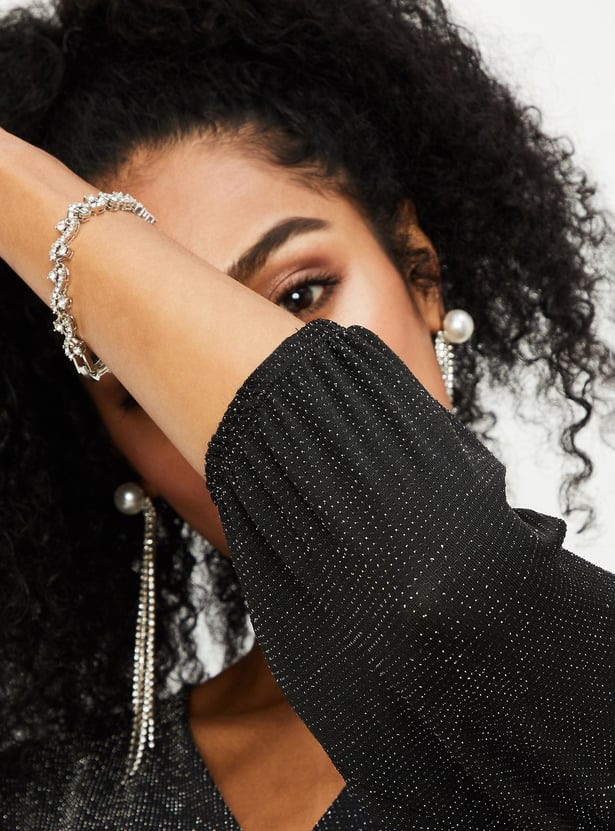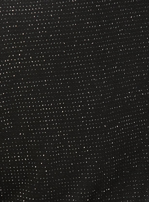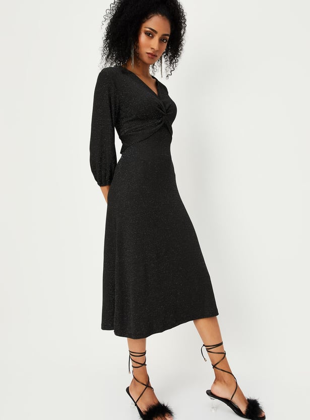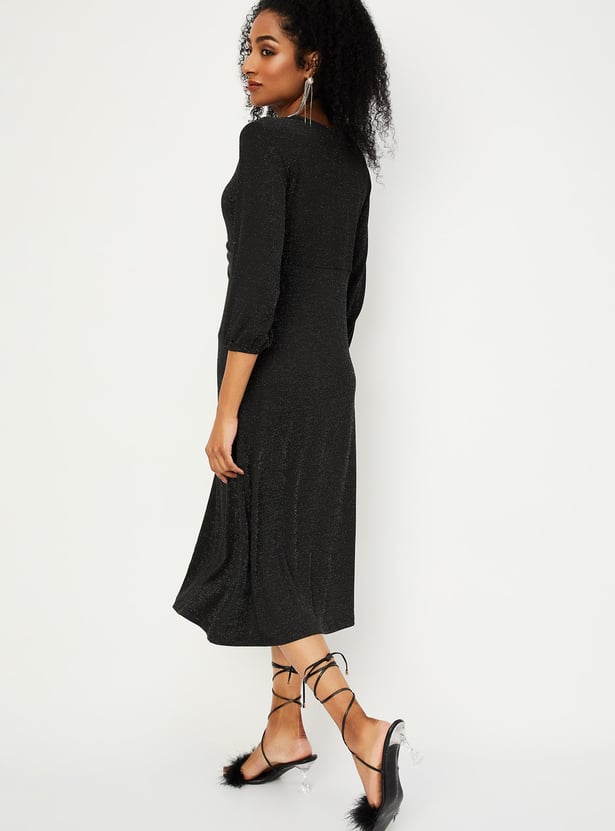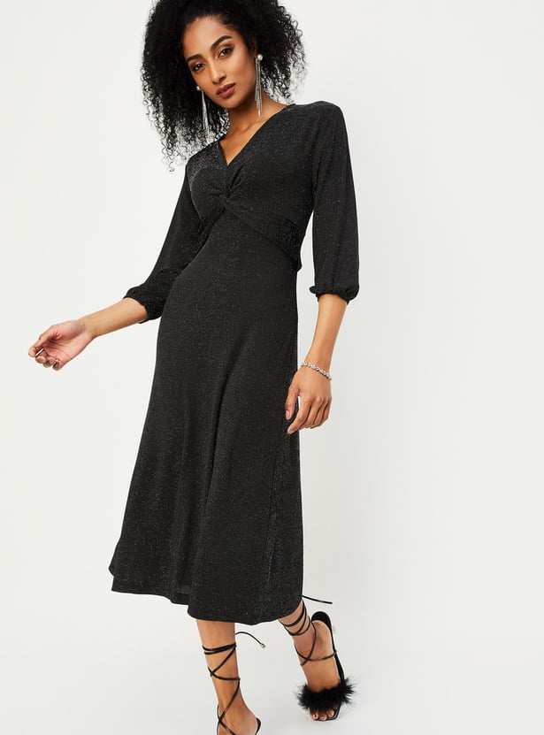 Shimmer and shine through the night in this midi dress. It has a V-neck, twisted detail at the waist, three-quarter sleeves, and an A-line profile.