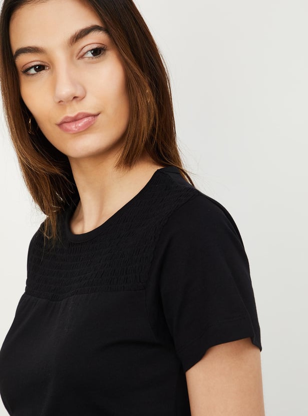 Elevate your fashion effortlessly with this T-shirt. Featuring a solid surface, smocked yoke, round neck, and half sleeves, it offers a stylish upgrade to your wardrobe.