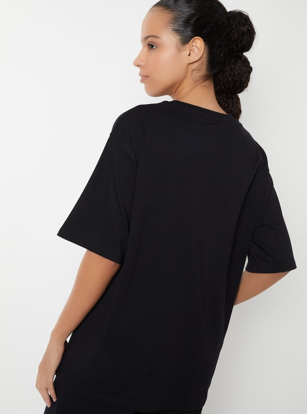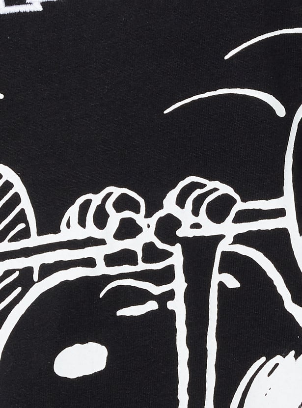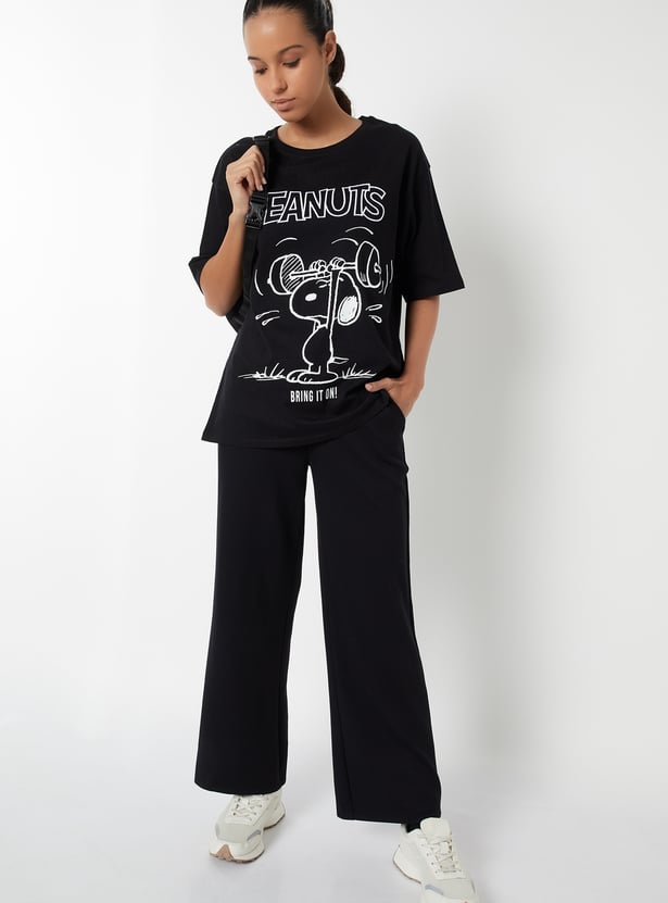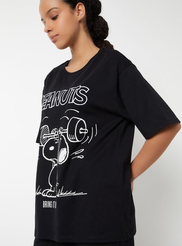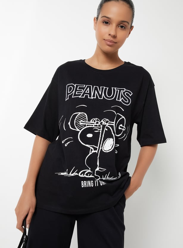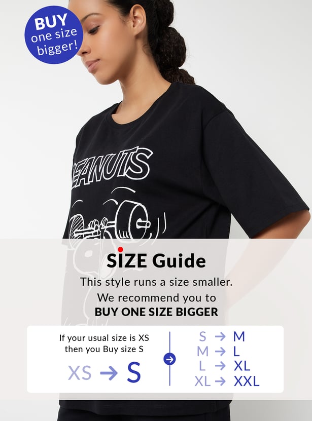 Stay cool and comfortable in this printed oversized sports T-shirt, featuring a round neck and half sleeves for a relaxed, breathable fit. Perfect for workouts or laid-back days, it is highlighted with a cute Snoopy print. Model Size :