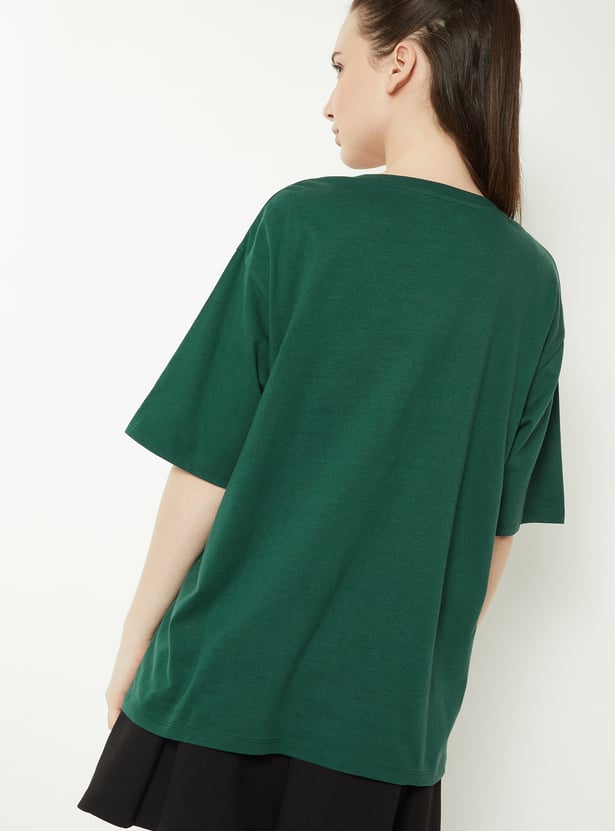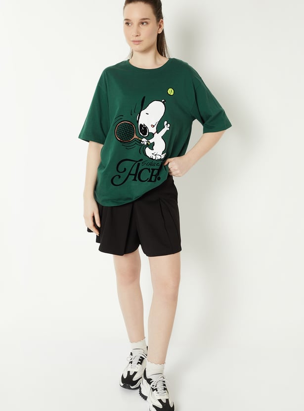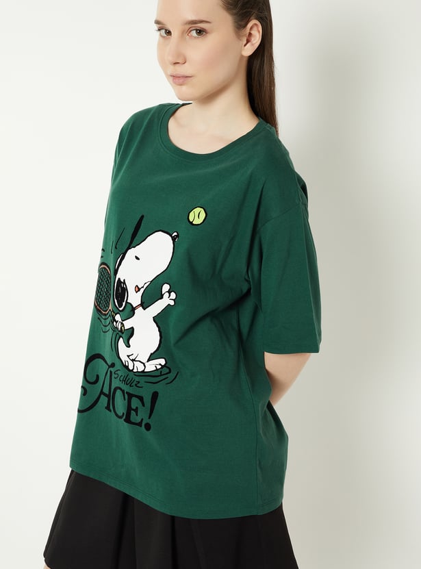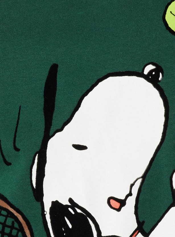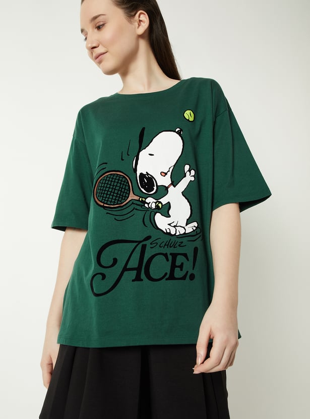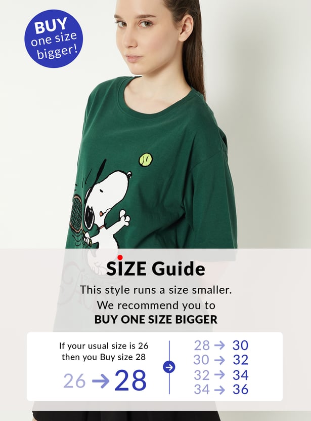 Stay cool and comfortable in this printed oversized sports T-shirt, featuring a round neck and half sleeves for a relaxed, breathable fit. Perfect for workouts or laid-back days, it is highlighted with a cute Snoopy print. Model Size :