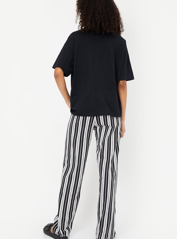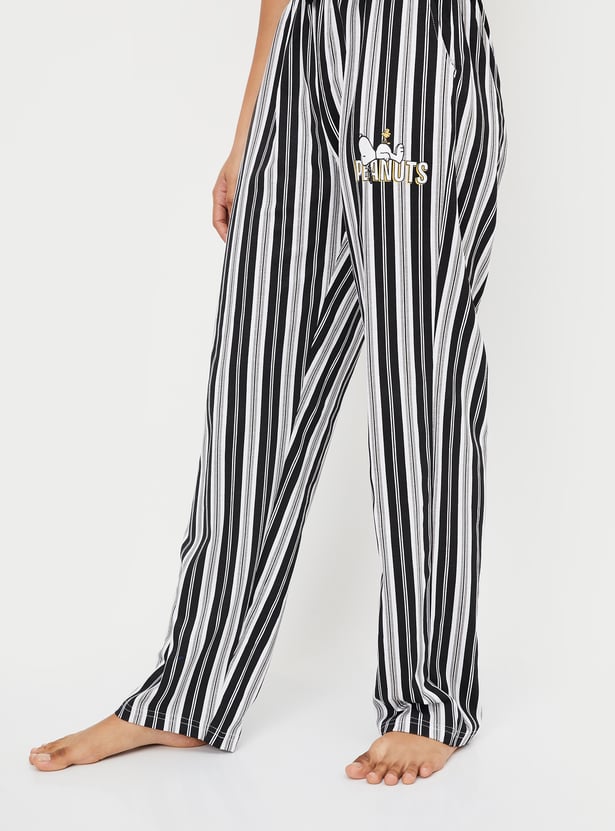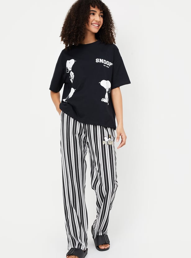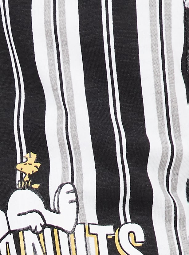 Relax in playful comfort with this Snoopy print PJ set, featuring a printed round-neck t-shirt with half sleeves for a cosy feel. Paired with striped pyjamas that come with an elasticated waistband and pockets, this set blends fun and functionality—perfect for lounging or a restful night’s sleep.