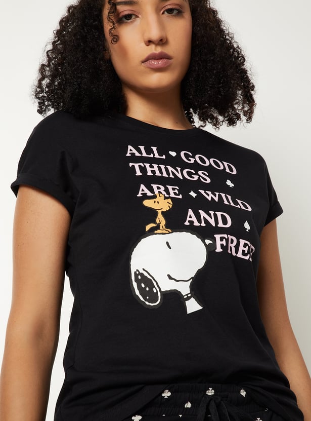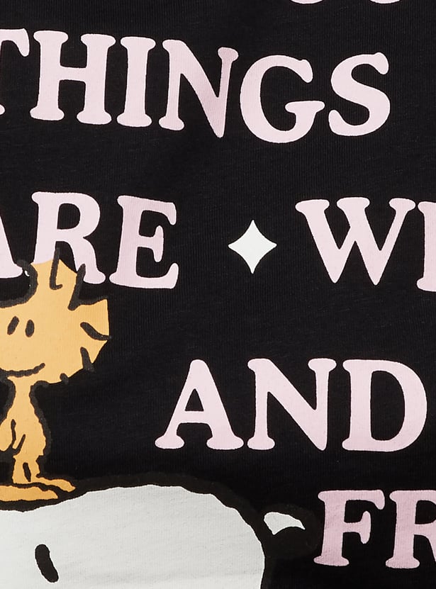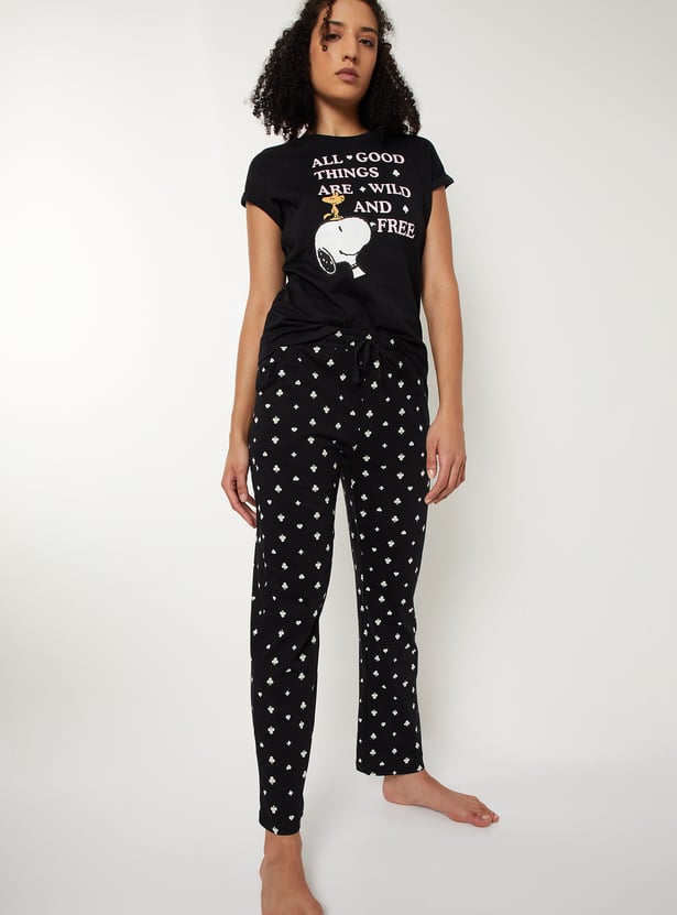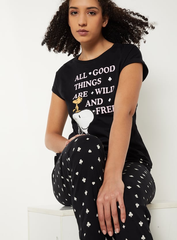 Stay cosy and stylish in this Snoopy printed pyjama set featuring a round‑neck, half‑sleeve top paired with pyjamas designed with an elasticated waist, drawstring, and handy pockets. Perfect for lounging or bedtime comfort.